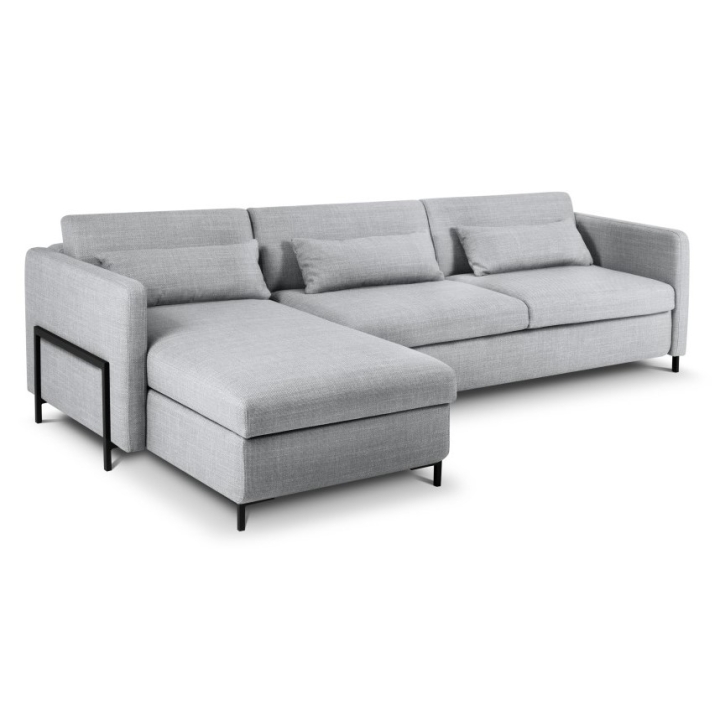 The stable construction of the corner sofa is based on a solid frame made of pine wood, chipboard and plywood. Black metal legs 10 cm high emphasise the modern design, while three backrest cushions and three bolsters filled with Foam Crisp and silicone add to the comfort. The Yanis 5-seater corner sofa is the perfect choice for those looking for a stylish solution for their living room.
