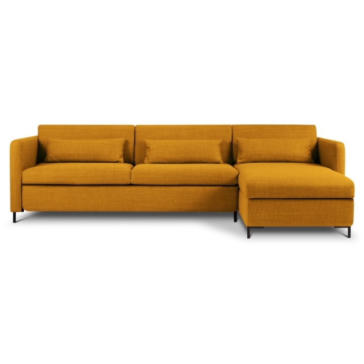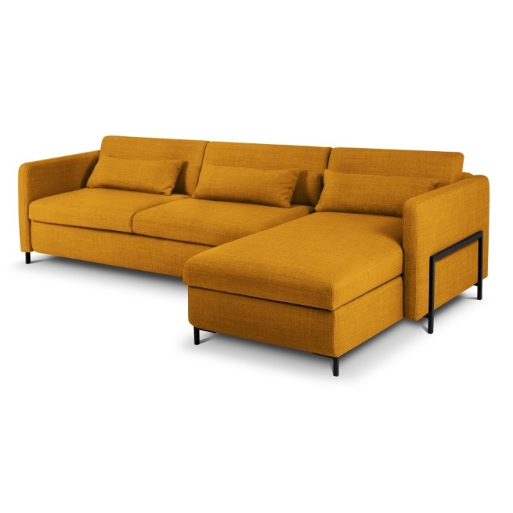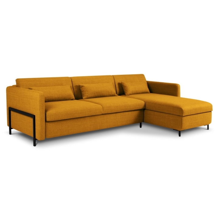 The stable construction of the corner sofa is based on a solid frame made of pine wood, chipboard and plywood. Black metal legs 10 cm high emphasise the modern design, while three backrest cushions and three bolsters filled with Foam Crisp and silicone add to the comfort. The Yanis 5-seater corner sofa is the perfect choice for those looking for a stylish solution for their living room.