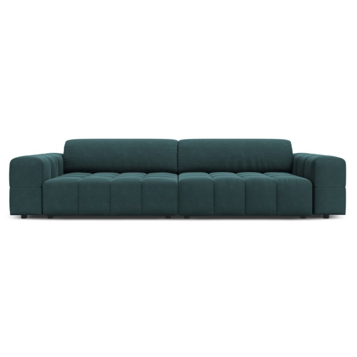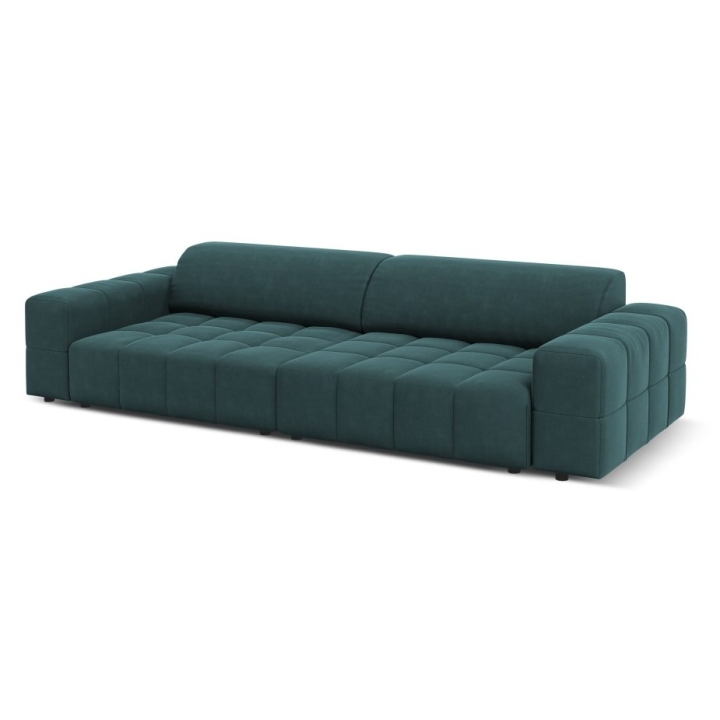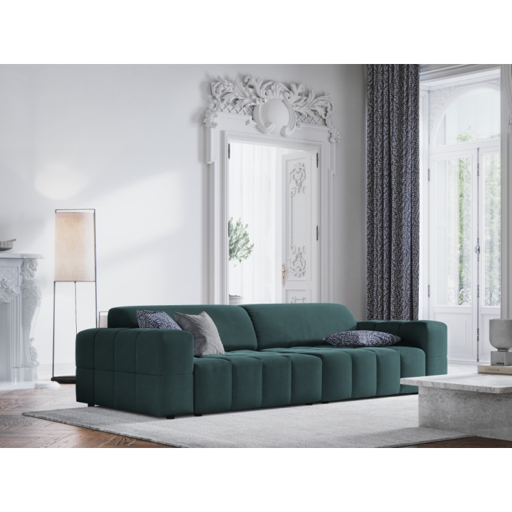The solid construction is based on a frame made of pine, particleboard and fibreboard, which ensures the stability and durability of the furniture. The sofa has low black legs made of plastic, which add a minimalist touch and emphasise its modern style. The wide armrests, 54 cm high, increase the comfort of the seat, and their subtle lines match perfectly with the velvet upholstery. As an added bonus, springs in the seat enhance the comfort and durability of the furniture.