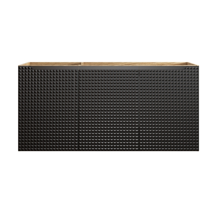 The cabinet body is made of laminated board in oiled oak, while the fronts are made of MDF in elegant black. An additional feature is the three-dimensional pyramids on the fronts, which give the furniture a modern touch. The cabinet is equipped with soft-closing hinges, which ensures comfortable use and quiet door operation.