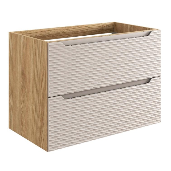 The OCEAN BEIGE 82-80-2S washbasin cabinet is a sophisticated choice for modern bathrooms. Its oiled oak body and MDF front in a beige shade exude natural charm. Wall-mounted, it features an integrated handle and two drawers, providing ample storage capacity and easy access to stored items.