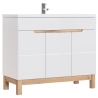 The fronts of the cabinet are made of durable MDF in a classic white colour, ensuring that they are resistant to everyday use. An additional advantage are the decorative inserts and legs in oak wotan shade, which bring a warm, natural accent to the bathroom interior. The laminated board body guarantees resistance to moisture, which is particularly important in bathroom furniture.