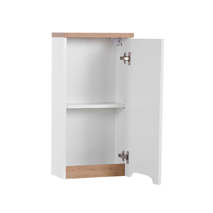 Equipped with a single door with a soft-closing mechanism and integrated handle in oak wotan, the cabinet guarantees smooth and noiseless closing, increasing the comfort of everyday use. Inside, there is one practical shelf, which makes it possible to organise cosmetics, hygienic utensils and other small items worth having always at hand.