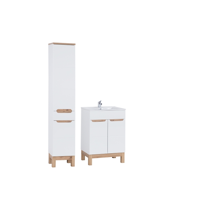 The tall Bali White 800 cabinet with a height of 187 cm, a width of 35 cm and a depth of 33 cm, also made of laminated board and MDF in Alpine White/White Kasai, offers plenty of storage space. Its slim shape and high-quality finish make it the perfect addition to the set, offering space for all the bathroom accessories you need.