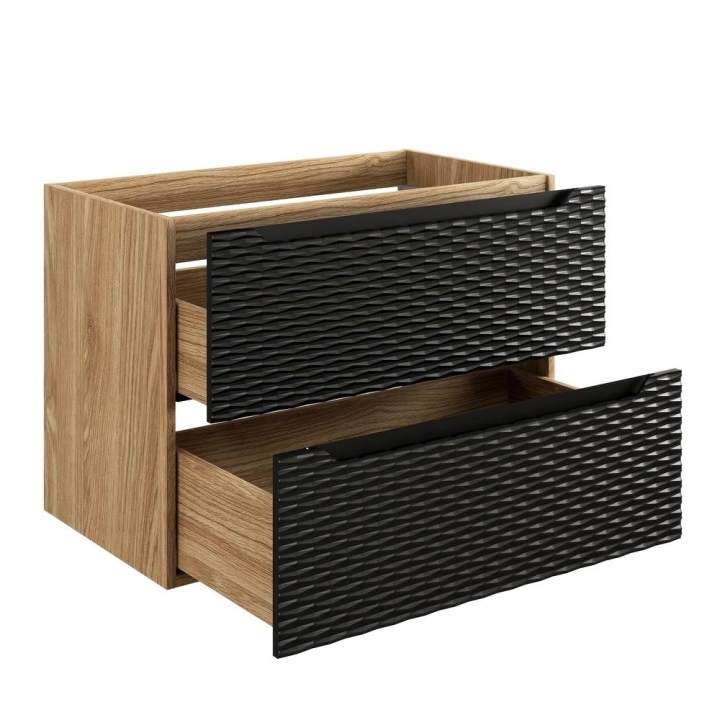 The fronts made of high-quality MDF with integrated handles bring a minimalist character to the interior and the cabinet guarantees solidity and durability for many years. The combination of black colour with oak elements introduces a subtle contrast to the space, giving the furniture a modern character. Measuring 80 cm wide, 46 cm deep and 57 cm high, this minimalist piece of furniture will fit perfectly into any bathroom, being not only an aesthetic addition, but also the focal point of the arrangement.