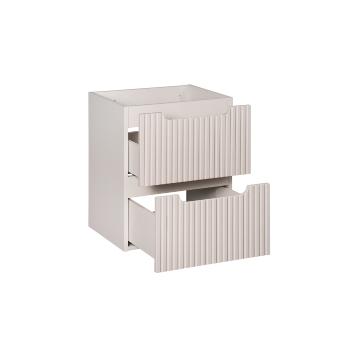 The Nova Cashmere 2S 50 cm washbasin cabinet is a unique piece of furniture from the NOVA collection, created with modern interiors in mind. Made of solid laminated board and MDF, the cabinet is maintained in a fashionable shade of cashmere. The matte finish of the fronts and body adds to its subtle charm. This model is equipped with two capacious drawers, which allows for convenient storage of items while maintaining aesthetics and order. The fluted fronts characteristic of the collection emphasise the modern style, while the compact dimensions - 50 cm wide, 57 cm high and 39 cm deep - make the cabinet ideal for small and medium-sized bathrooms. Thus, this model seamlessly combines storage function with minimalist design.