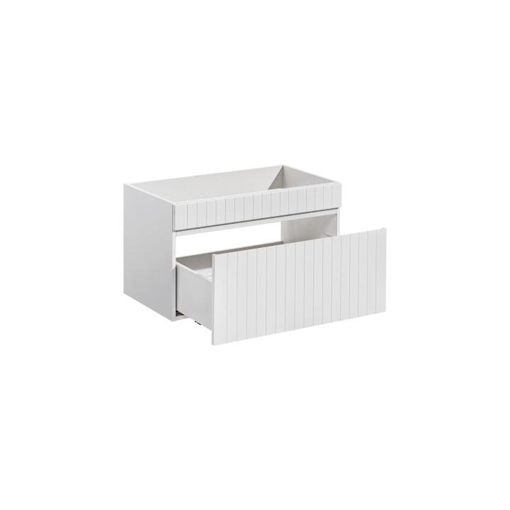 The fronts are made of MDF with a matt finish and the body is made of laminated board, ensuring resistance to moisture and durability for years to come. One drawer without a door offers storage space for essential bathroom accessories. The lack of internal shelves makes the drawer interior more spacious and easy to arrange. Handle integrated into the cabinet front.
