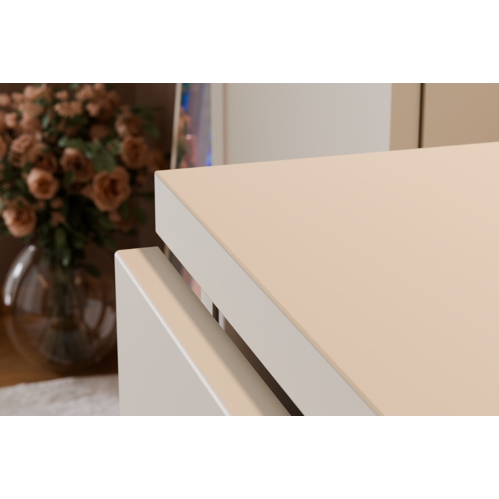 The Donna Sand collection worktop by Comad is a carefully finished piece in a sandy-beige shade, designed to be mounted on a under-sink cabinet. Its subtle colouring brings warmth and subdued elegance to the interior. It suits arrangements based on natural tones.