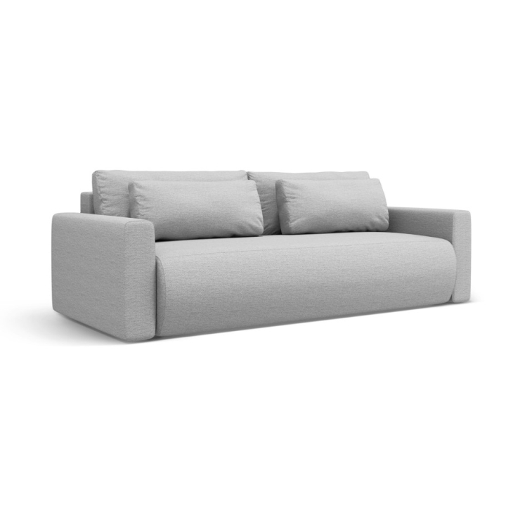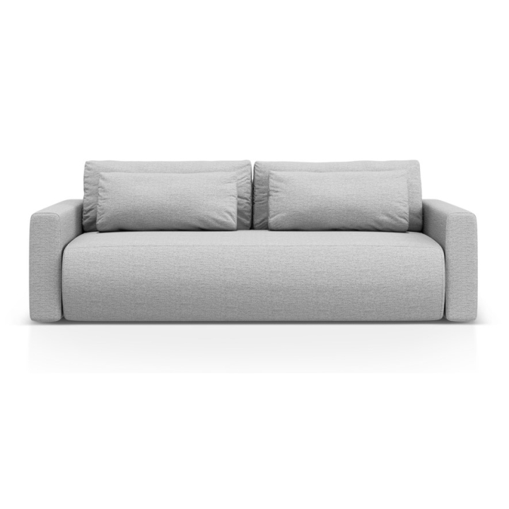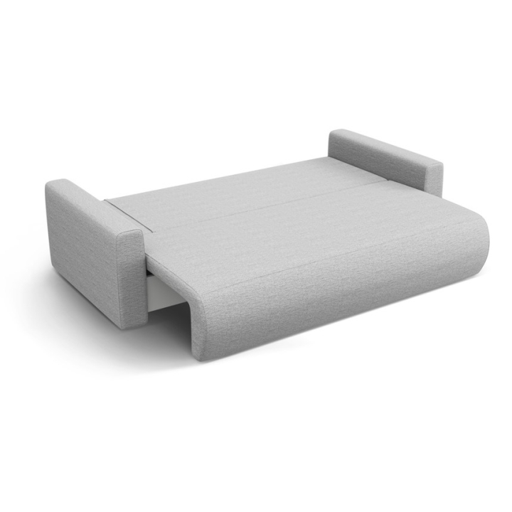 The Belfast 3-seater sofa with sleeping function and bedding box 3SF Cosmopolitan-Design is a modern model created with comfort and space utilisation in mind. The sofa is 238 cm wide, 105 cm deep, 84 cm high and the width of the armrests is 18 cm. Thanks to its robust construction and maximum load capacity of up to 350 kg, the sofa will work well in both the living room and guest room. The low plastic legs in black provide stability and durability, while the choice of structured fabric in various colours allows you to match the furniture to any interior.