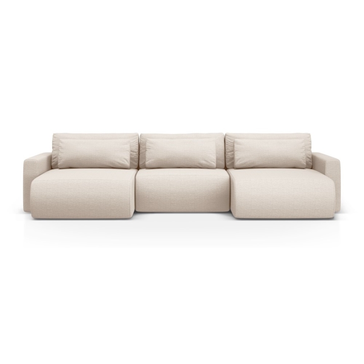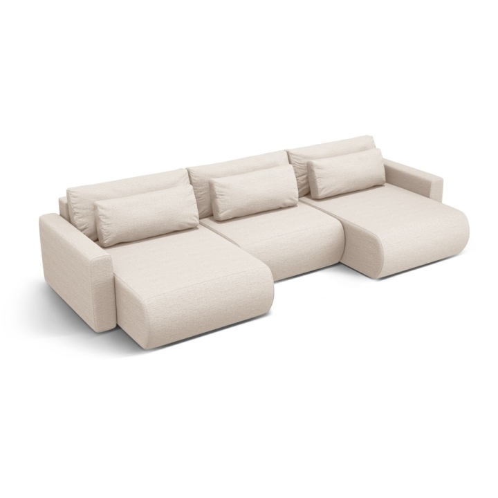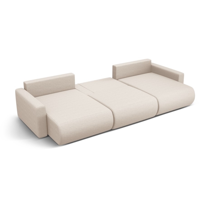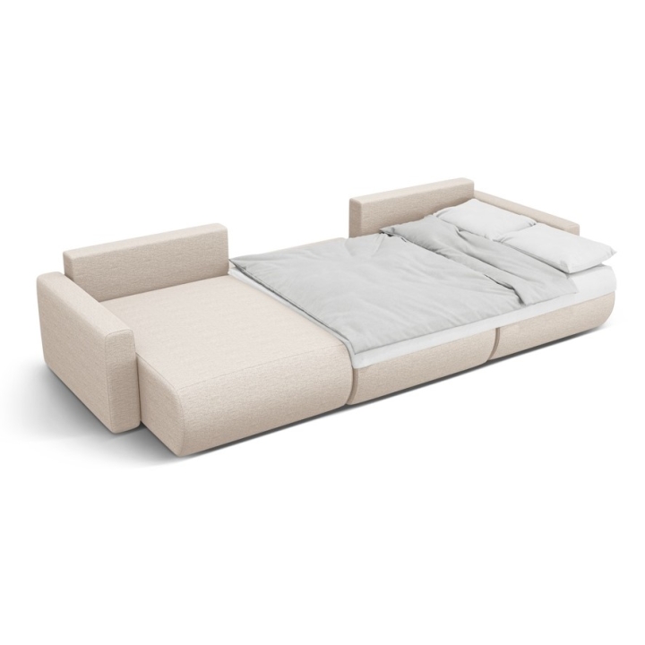 The seat consists of polyurethane foam with a density of 30 kg/m³ and a layer of 200 g/m² wadding, supported by corrugated springs for comfort and durability. The backrest filled with cut foam and silicone guarantees soft back support. The 300 × 135 cm sleeping function provides a comfortable place to sleep for two people, while the bedding container allows for the storage of duvets and pillows.