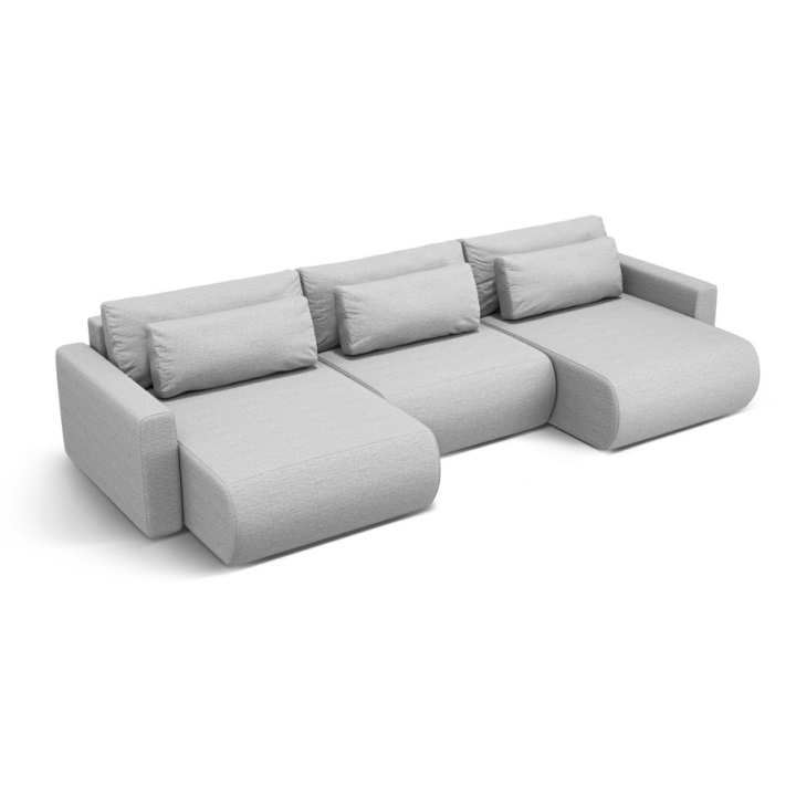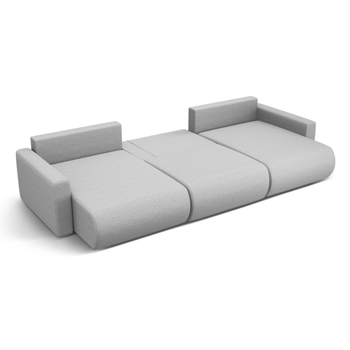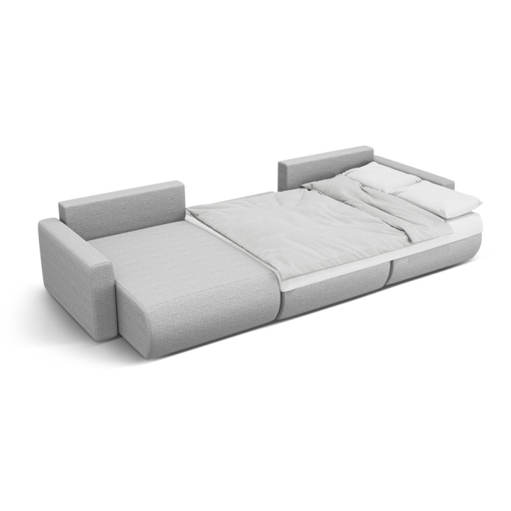 The seat consists of polyurethane foam with a density of 30 kg/m³ and a layer of 200 g/m² wadding, supported by corrugated springs for comfort and durability. The backrest filled with cut foam and silicone guarantees soft back support. The 300 × 135 cm sleeping function provides a comfortable place to sleep for two people, while the bedding container allows for the storage of duvets and pillows.