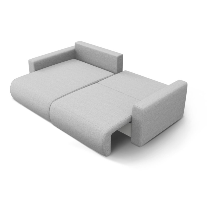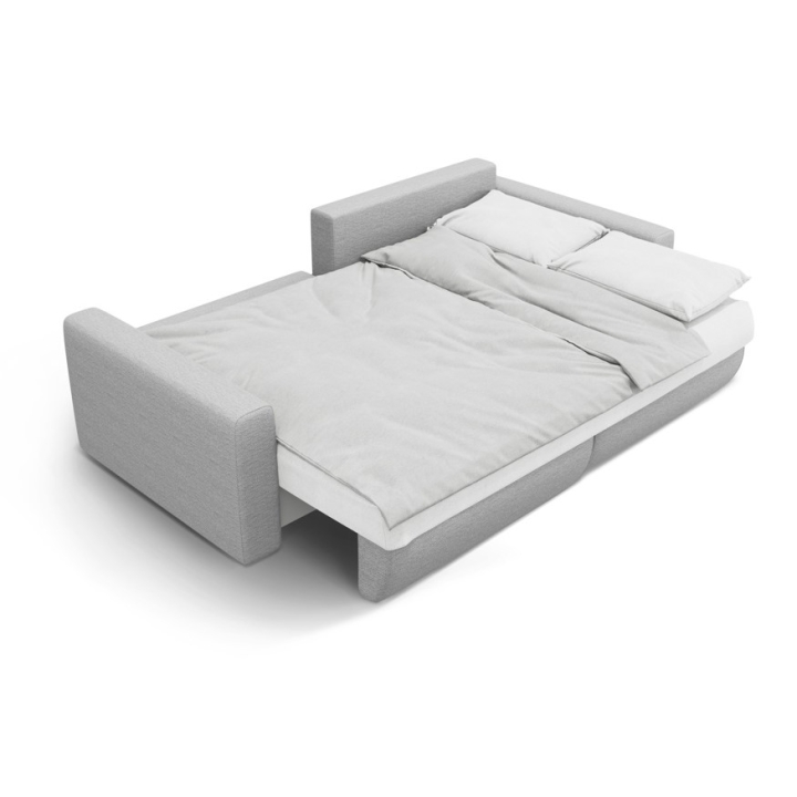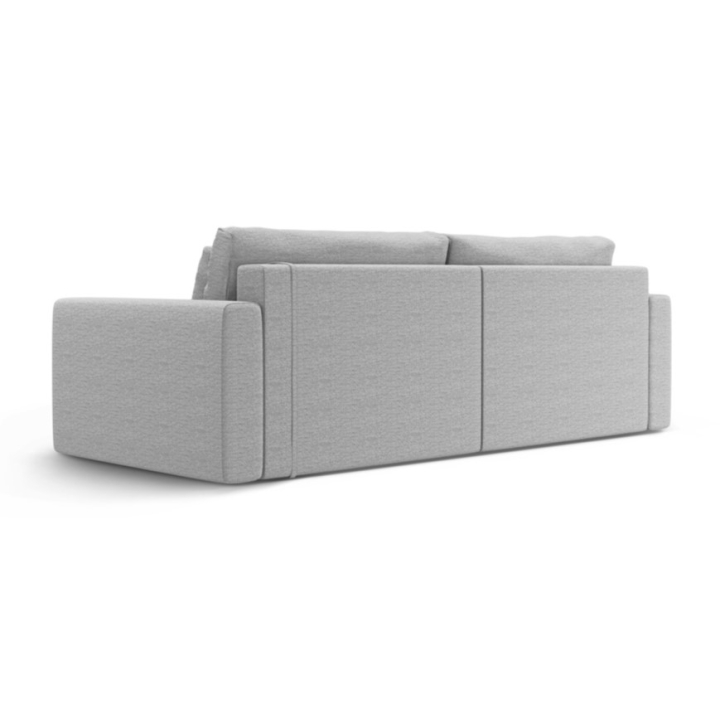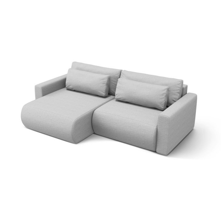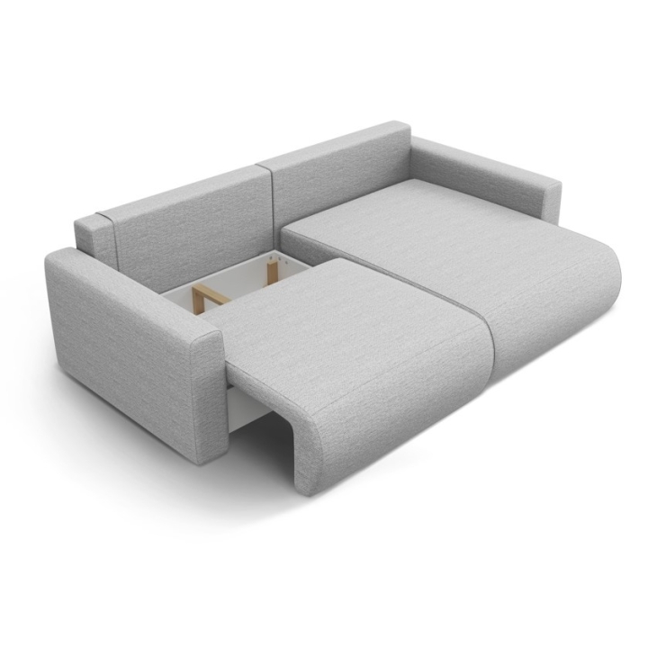 The seat is filled with 30 kg/m³ polyurethane foam and a layer of 200 g/m² cotton wool, with additional support provided by corrugated springs. The backrest consists of cut foam and silicone, which guarantees soft back support. The 200 × 135 cm corner sofa with sleeping function provides comfortable sleeping space for two people, and the bedding container makes it easy to store quilts and pillows.