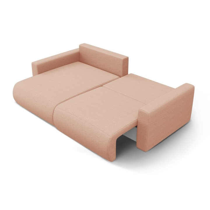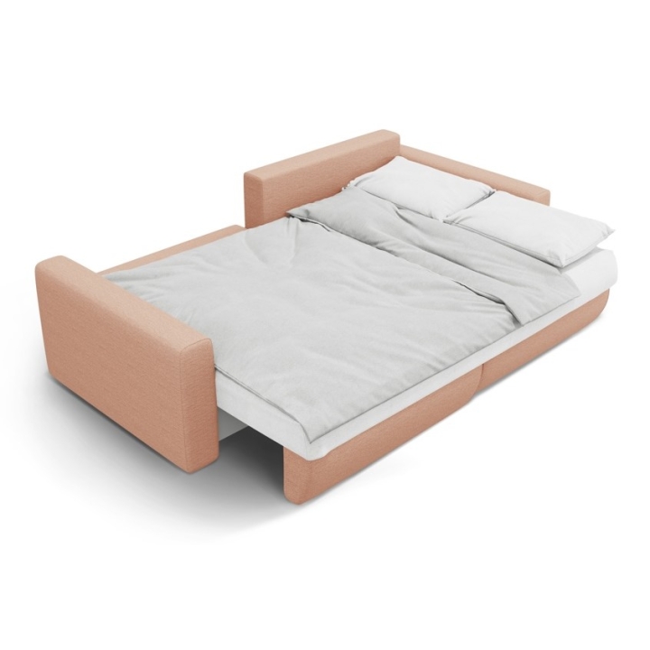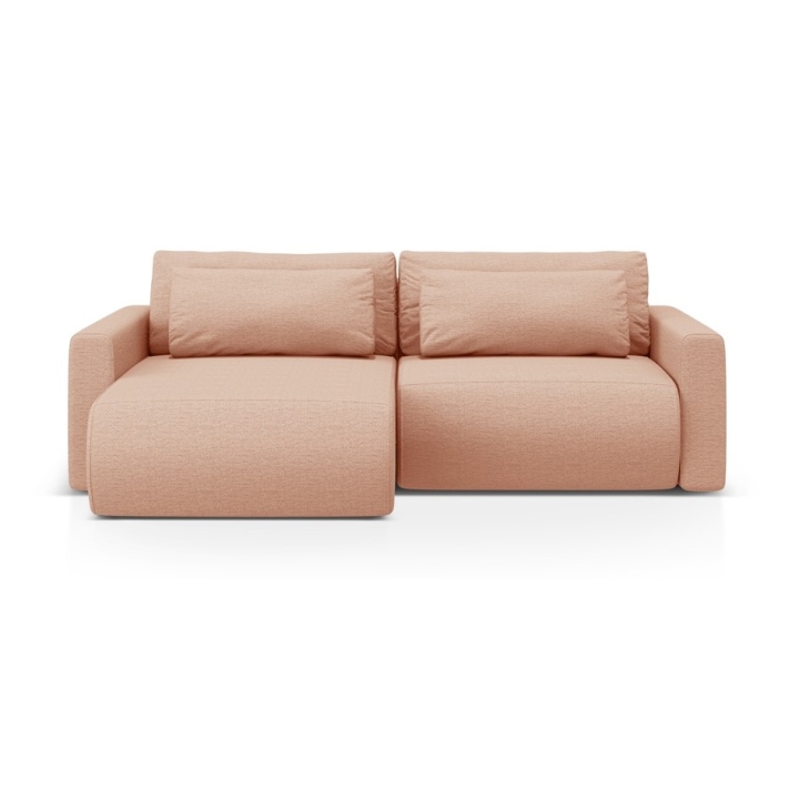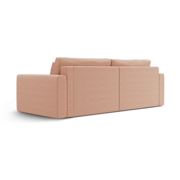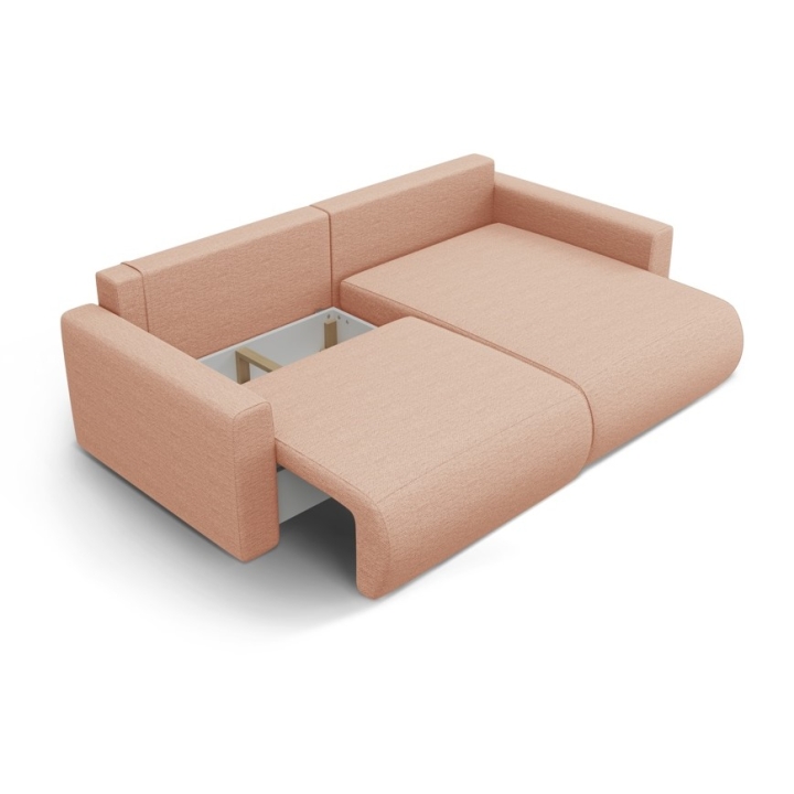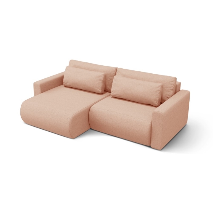 The seat is filled with 30 kg/m³ polyurethane foam and a layer of 200 g/m² cotton wool, with additional support provided by corrugated springs. The backrest consists of cut foam and silicone, which guarantees soft back support. The 200 × 135 cm corner sofa with sleeping function provides comfortable sleeping space for two people, and the bedding container makes it easy to store quilts and pillows.