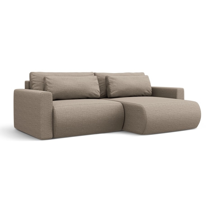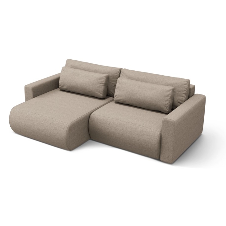The frame is made of solid pine, particleboard, fibreboard and plywood to ensure durability and stability of the structure. Decorative cushions as standard add to the comfort of use. The 3-seater corner sofa with a sleeping function and a bedding container is a practical choice for modern interiors.