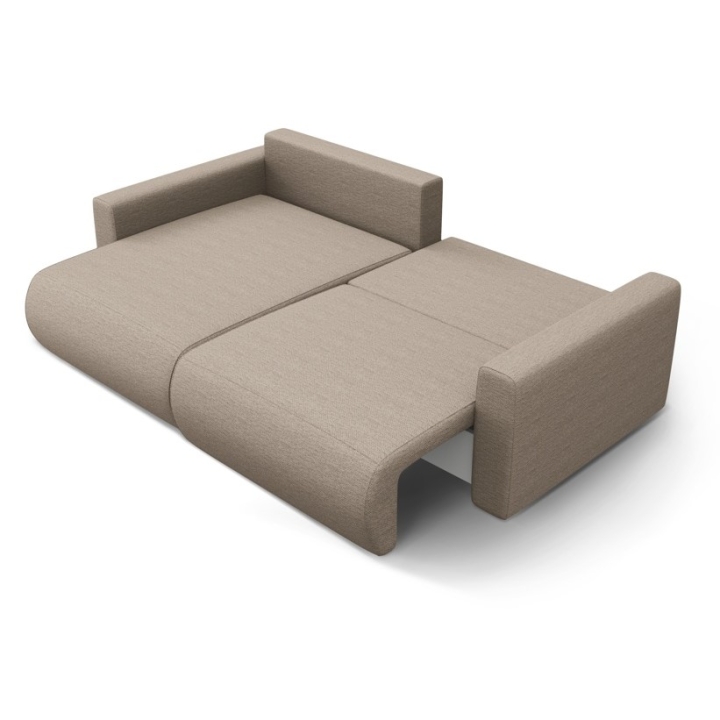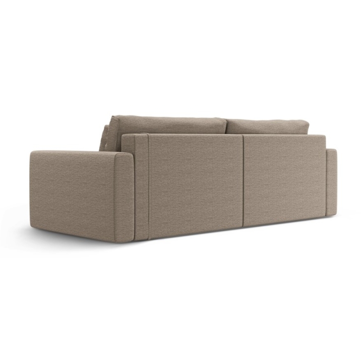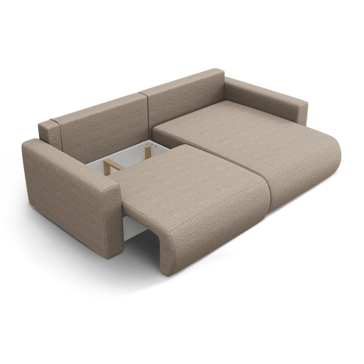 The seat is filled with 30 kg/m³ polyurethane foam and a layer of 200 g/m² cotton wool, with additional support provided by corrugated springs. The backrest consists of cut foam and silicone, which guarantees soft back support. The 200 × 135 cm corner sofa with sleeping function provides comfortable sleeping space for two people, and the bedding container makes it easy to store quilts and pillows.
