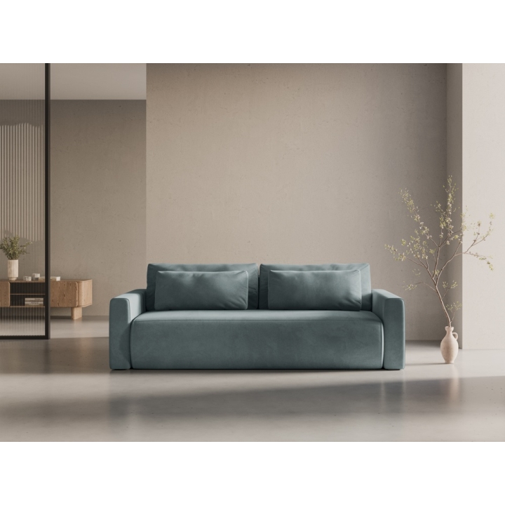 The 3-seater sofa with sleeping function and bedding compartment 3SF Belfast Velour Cosmopolitan-Design is a modern model created with comfort and maximum use of space in mind. The sofa is 238 cm wide, 105 cm deep, 84 cm high and the width of the armrests is 18 cm. With a robust construction and a maximum load capacity of up to 350 kg, the sofa will work well in both the living room and guest room. The low plastic legs in black provide stability and durability, while the upholstery in velour fabric available in various colour variants allows you to match the furniture to any arrangement.