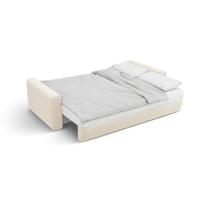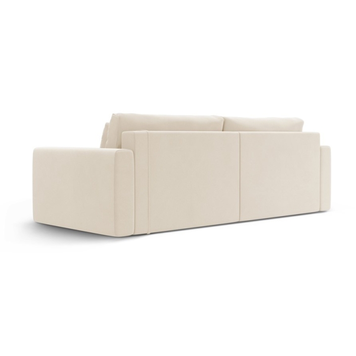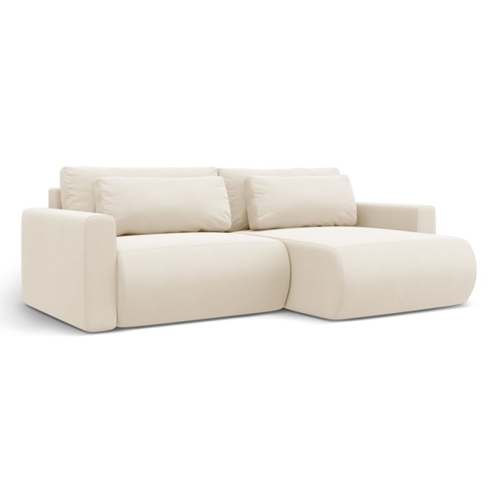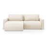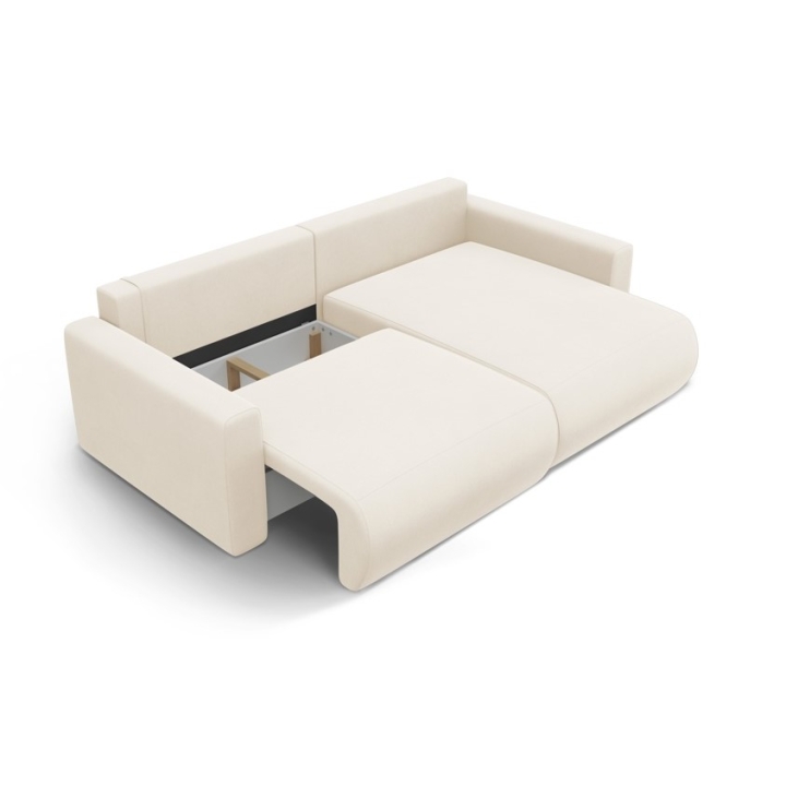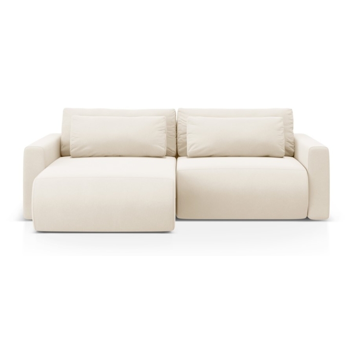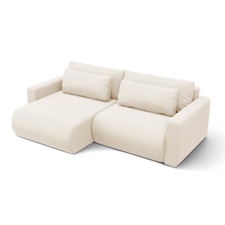 The seat is filled with 30 kg/m³ polyurethane foam and a layer of 200 g/m² cotton wool, with additional support provided by corrugated springs. The backrest consists of cut foam and silicone, which guarantees soft back support. The 200 × 135 cm corner sofa with sleeping function provides comfortable sleeping space for two people, and the bedding container makes it easy to store quilts and pillows.
