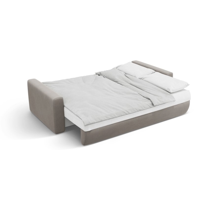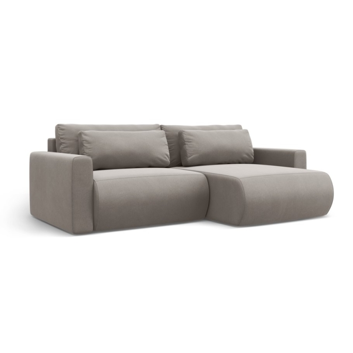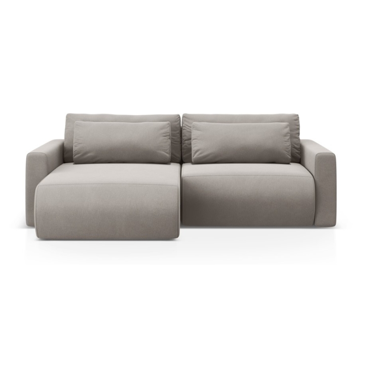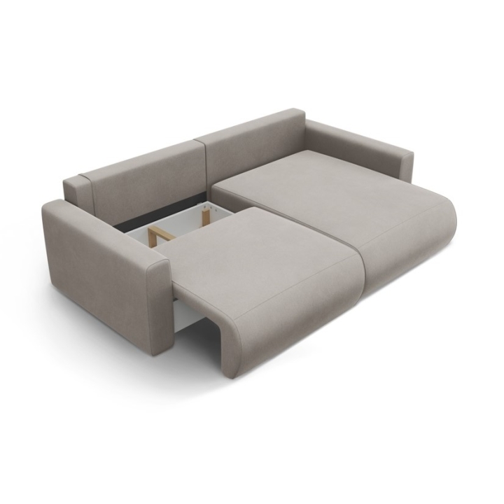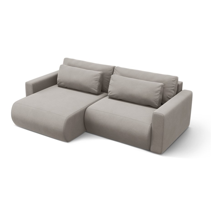 The seat is filled with 30 kg/m³ polyurethane foam and a layer of 200 g/m² cotton wool, with additional support provided by corrugated springs. The backrest consists of cut foam and silicone, which guarantees soft back support. The 200 × 135 cm corner sofa with sleeping function provides comfortable sleeping space for two people, and the bedding container makes it easy to store quilts and pillows.