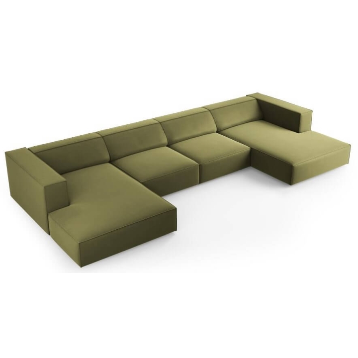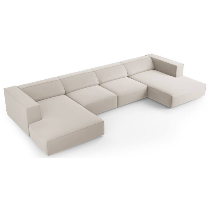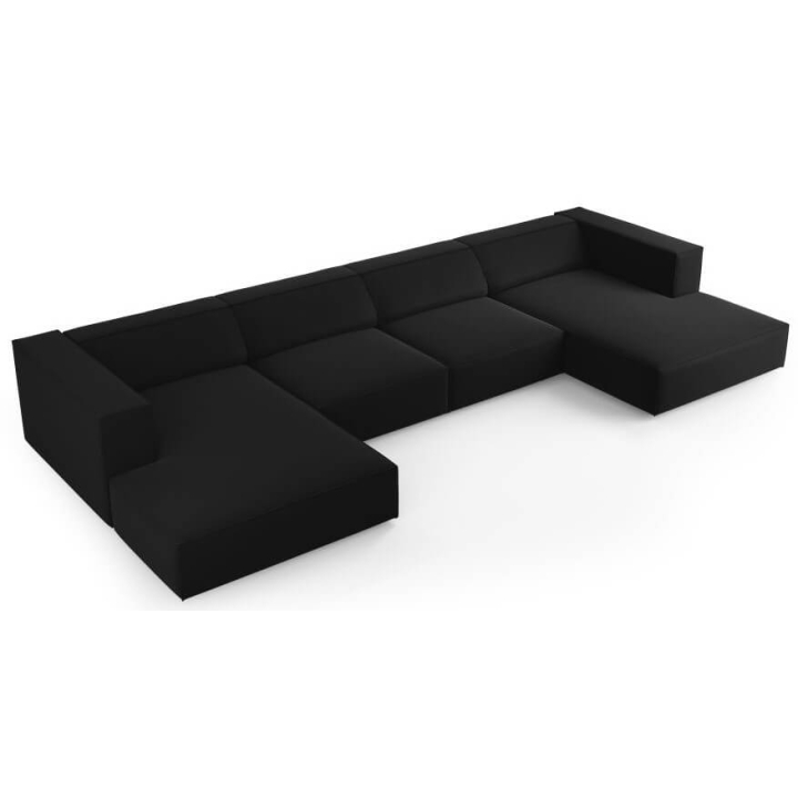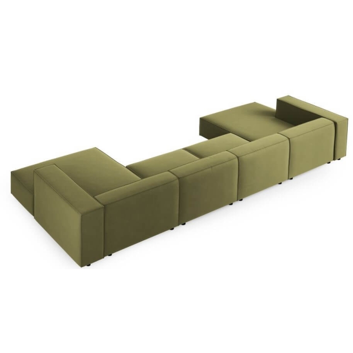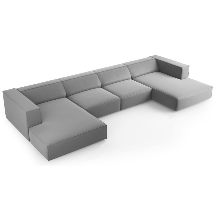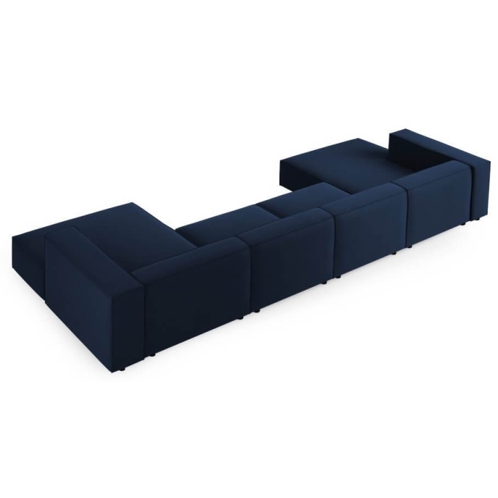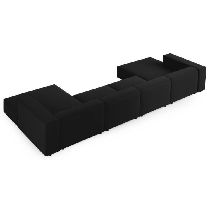 The 6-seater Arendal velour sofa bed from Cosmopolitan Designis a piece of furniture with a width of 364 cm, a depth of 166 cm and an overall height of 70 cm distinguished by its spacious layout, providing comfort for up to six people. The two chaise longues positioned on the sides, 166 cm long and 102 cm wide, create a symmetrical composition conducive to relaxation. The armrests, 22 cm wide and 54 cm high, provide comfortable support for the hands.