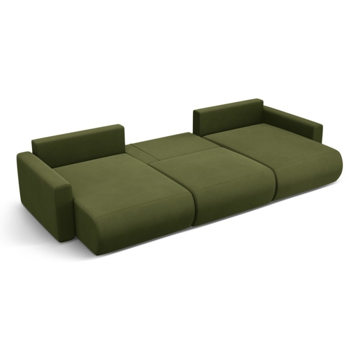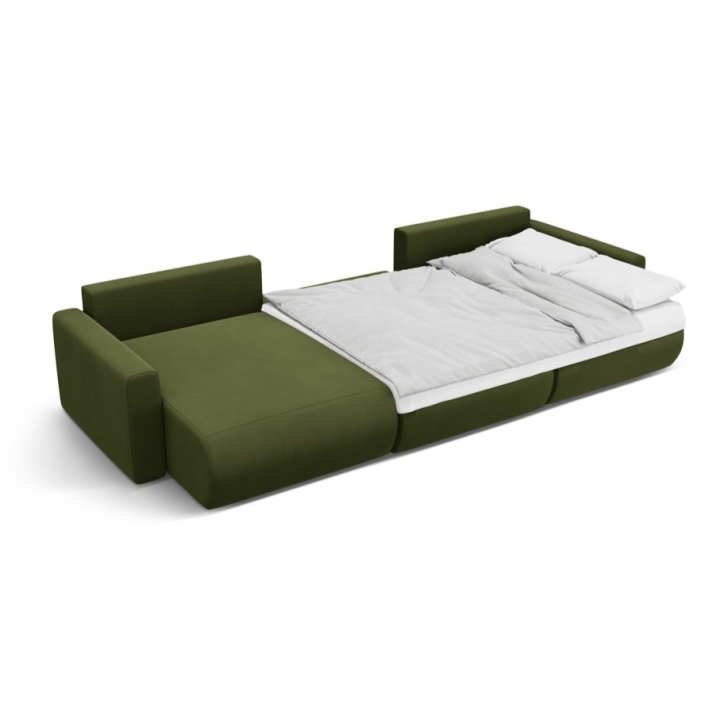 The seat consists of polyurethane foam with a density of 30 kg/m³ and a layer of 200 g/m² cotton wool, supported by corrugated springs to ensure comfort and durability. The backrest filled with cut foam and silicone guarantees soft back support. The 300 × 135 cm sleeping function offers comfortable rest for two people, and the bedding container allows you to store additional duvets and pillows.
