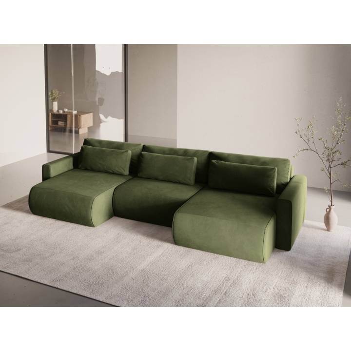 The Belfast Velour Cosmopolitan-Design 4-seater corner sofa with sleeping function and bedding storage is a spacious and comfortable piece of furniture, ideal for large interiors. The corner sofa is 340 cm wide, 149 cm deep, 84 cm high, with 18 cm wide and 60 cm high armrests. The U-shaped model is equipped with two wide recliners with a usable depth of 114 cm to 132 cm, when the cushions are removed (total depth 149cm of each recliner ) which provide a large surface for relaxation. The black plastic legs guarantee stability and the velour fabric upholstery, available in a variety of colours, allows you to match the corner sofa to your interior design.