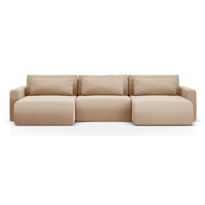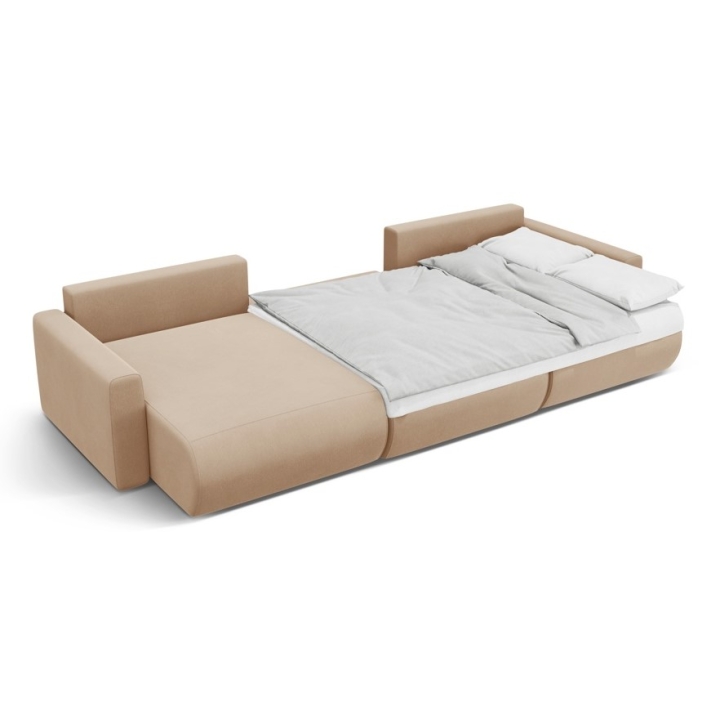 The seat consists of polyurethane foam with a density of 30 kg/m³ and a layer of 200 g/m² cotton wool, supported by corrugated springs to ensure comfort and durability. The backrest filled with cut foam and silicone guarantees soft back support. The 300 × 135 cm sleeping function offers comfortable rest for two people, and the bedding container allows you to store additional duvets and pillows.