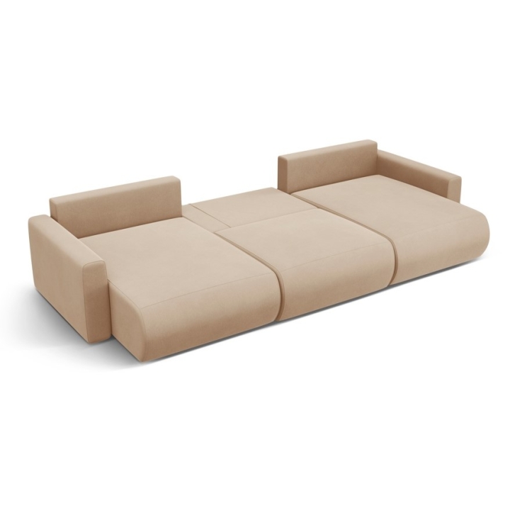 The Belfast Velour Cosmopolitan-Design 4-seater corner sofa with sleeping function and bedding storage is a spacious and comfortable piece of furniture, ideal for large interiors. The corner sofa is 340 cm wide, 149 cm deep, 84 cm high, with 18 cm wide and 60 cm high armrests. The U-shaped model is equipped with two wide recliners with a usable depth of 114 cm to 132 cm, when the cushions are removed (total depth 149cm of each recliner ) which provide a large surface for relaxation. The black plastic legs guarantee stability and the velour fabric upholstery, available in a variety of colours, allows you to match the corner sofa to your interior design.