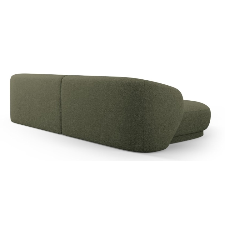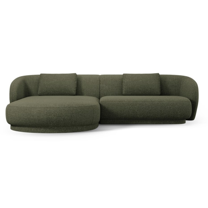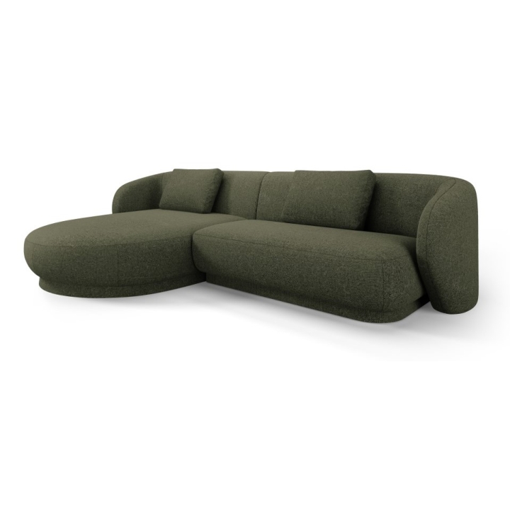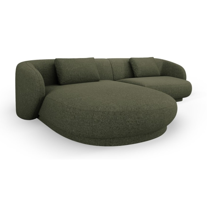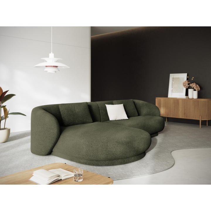 The Camden 4-seater Chenille Cosmopolitan-design corner sofa is a modern piece of furniture with a rounded shape that fits perfectly in contemporary living room interiors. The width of the corner is 289 cm, the depth of the longer side is 177 cm, the shorter side is 102 cm and the height is 72 cm. The seat height is 39 cm, which ensures a comfortable sitting position. The model does not have a sleeping function or a bedding container. The corner sofa is set on low black plastic legs, which emphasise the modern design.