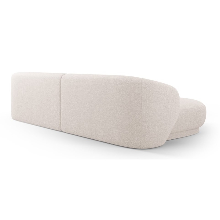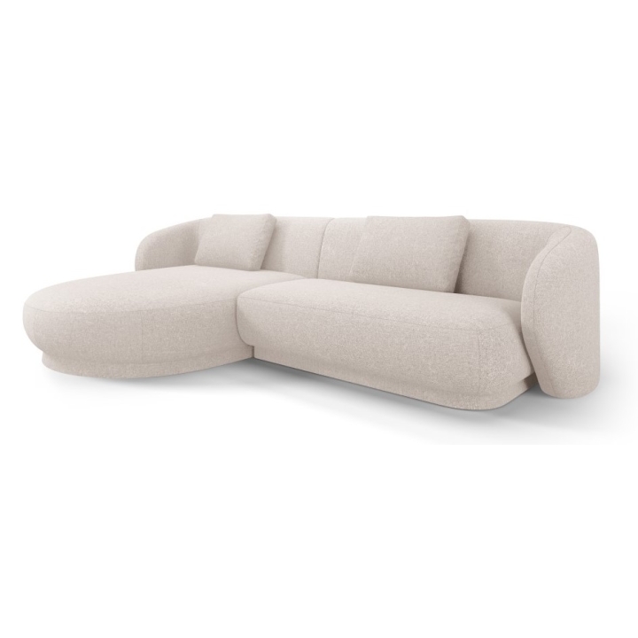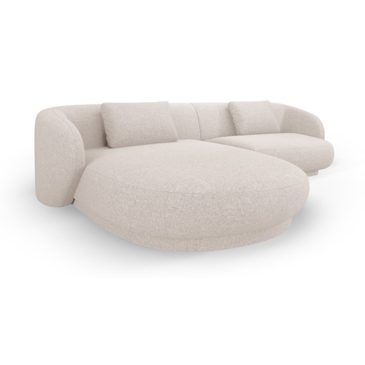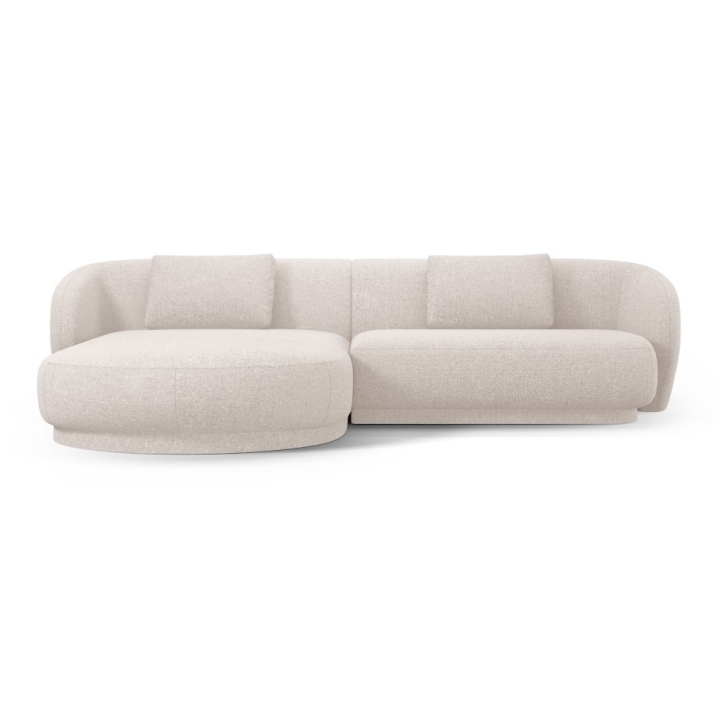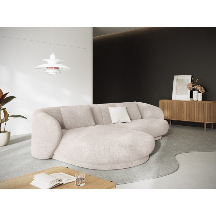 The Camden 4-seater Chenille Cosmopolitan-design corner sofa is a modern piece of furniture with a rounded shape that fits perfectly in contemporary living room interiors. The width of the corner is 289 cm, the depth of the longer side is 177 cm, the shorter side is 102 cm and the height is 72 cm. The seat height is 39 cm, which ensures a comfortable sitting position. The model does not have a sleeping function or a bedding container. The corner sofa is set on low black plastic legs, which emphasise the modern design.