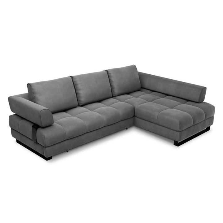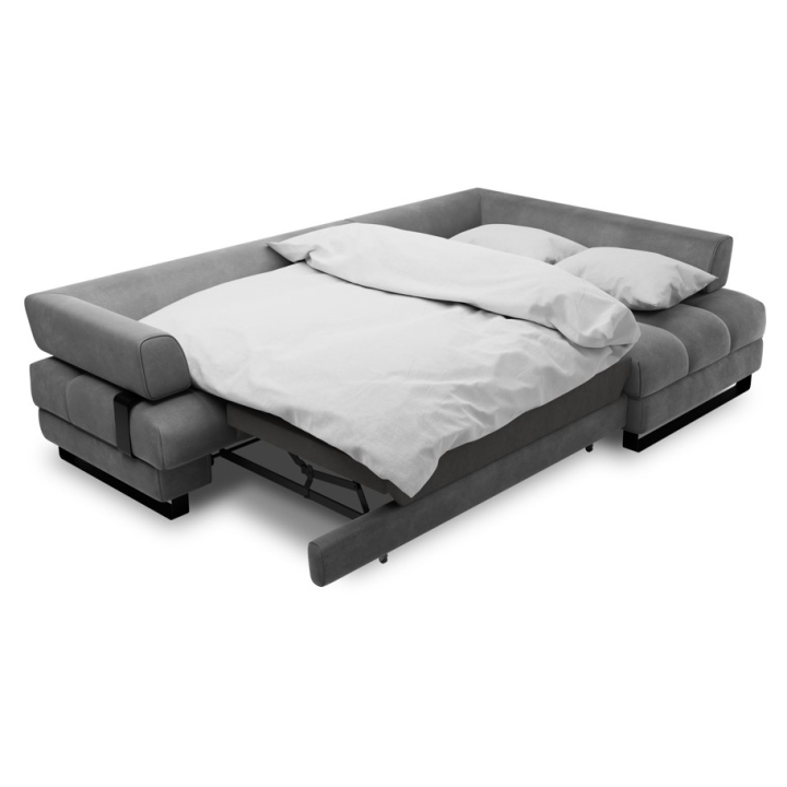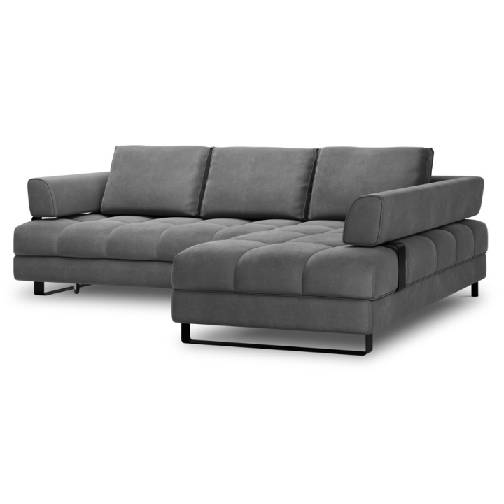 The 5-seater Clinton Velvet Cosmopolitan-design corner sofa is a large, comfortable piece of furniture with a sleeping function and a bedding container , which is perfect for spacious interiors. The corner sofa is 272 cm wide, 173 cm deep, 89 cm high and the height of the armrests is 72 cm. The model is equipped with a chaise longue with a width of 79 cm and a usable depth of 130/151 cm, providing a large surface area for relaxation. The metal black legs, 12 cm high, add to the modern look and make it easy to keep clean under the furniture.