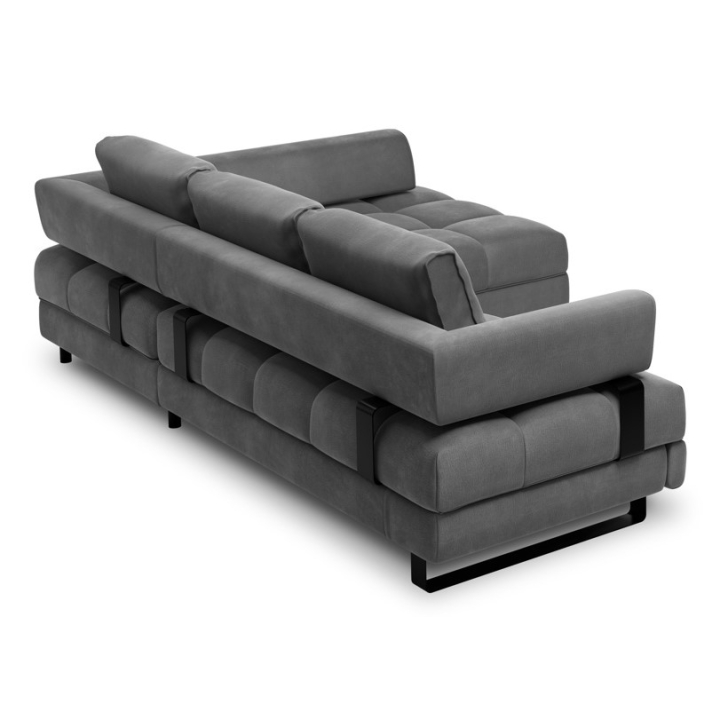 The seat made of 30 kg/m³ polyurethane foam combined with springs ensures comfortable use and resistance to deformation. The silicone-filled backrest guarantees soft back support and comfort during long use. The upholstery made of velvet Monolith fabric with a subtle sheen, resistant to abrasion (Martindale test: 100,000), has been enriched with waterproof technology, which protects against the ingress of liquids and dirt. This makes the corner sofa ideal for homes with children and pets.