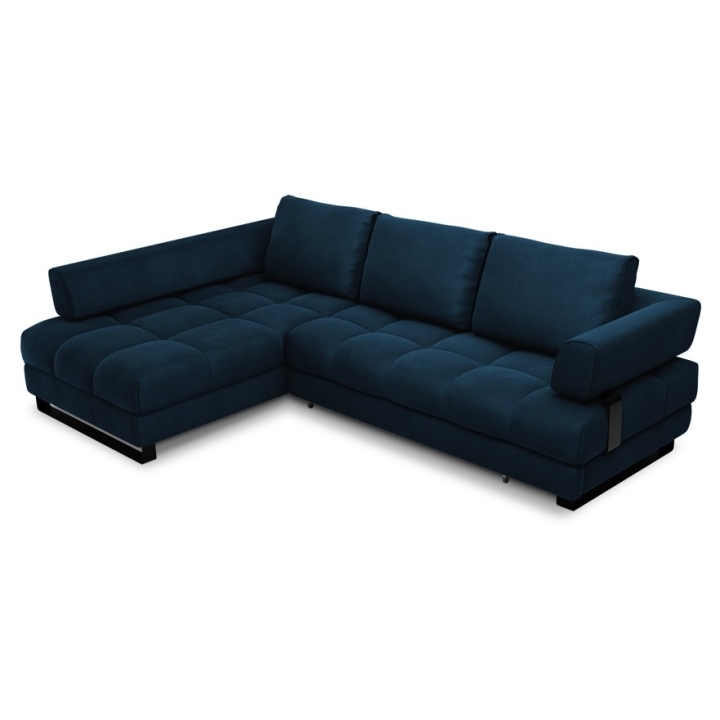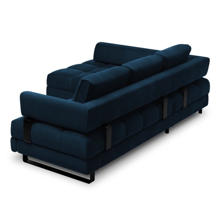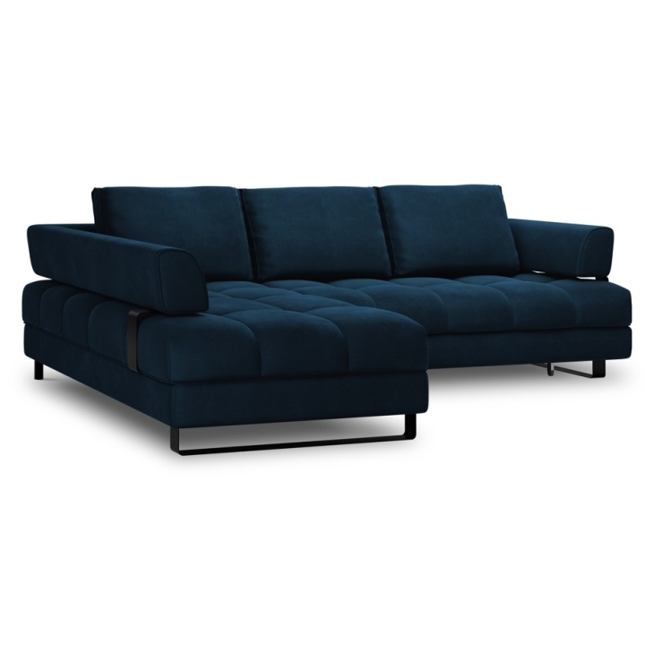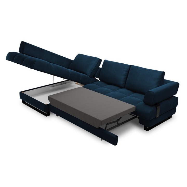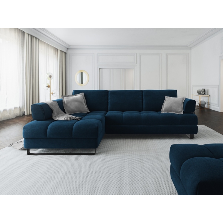 The 5-seater Clinton Velvet Cosmopolitan-design corner sofa is a large, comfortable piece of furniture with a sleeping function and a bedding container , which is perfect for spacious interiors. The corner sofa is 272 cm wide, 173 cm deep, 89 cm high and the height of the armrests is 72 cm. The model is equipped with a chaise longue with a width of 79 cm and a usable depth of 130/151 cm, providing a large surface area for relaxation. The metal black legs, 12 cm high, add to the modern look and make it easy to keep clean under the furniture.