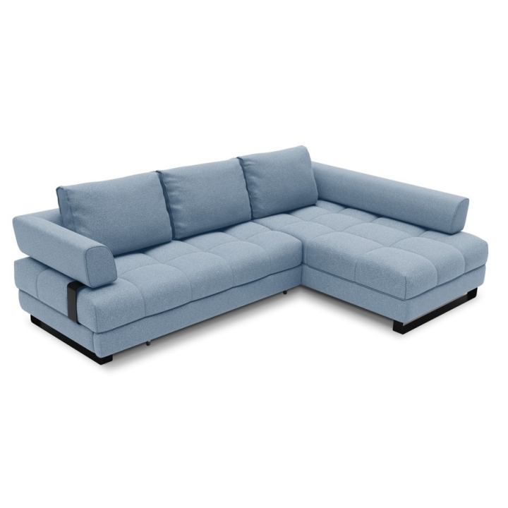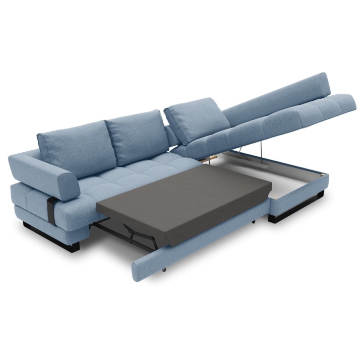 The Clinton 5-seater corner sofa in Structured Fabric Cosmopolitan-design is a large corner sofa with sleeping function and bedding storage, ideal for modern interiors. It has a width of 272 cm, a depth of 173 cm, a height of 89 cm and armrests 16-20 cm wide and 72 cm high to provide comfortable support. The model features a chaise longue with a width of 79 cm and a usable depth of 13o cm to 151 cm when the cushions are removed, giving you a large surface to rest on. Black metal legs 12 cm high emphasise the modern look of the furniture and make it easy to keep clean.