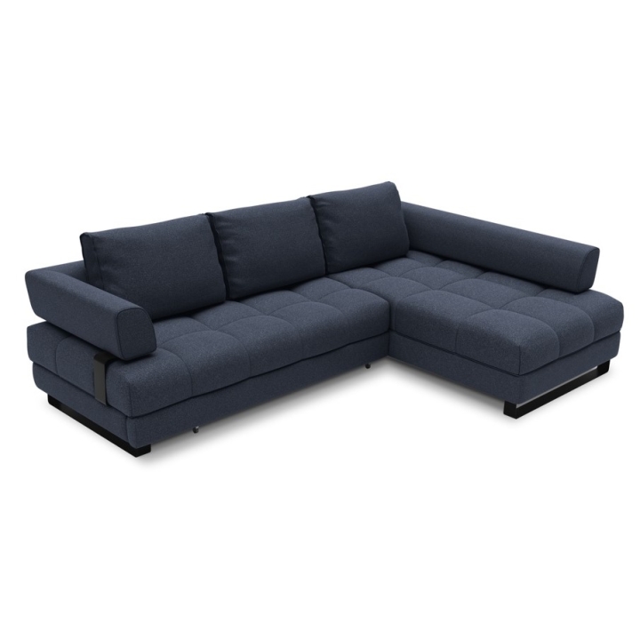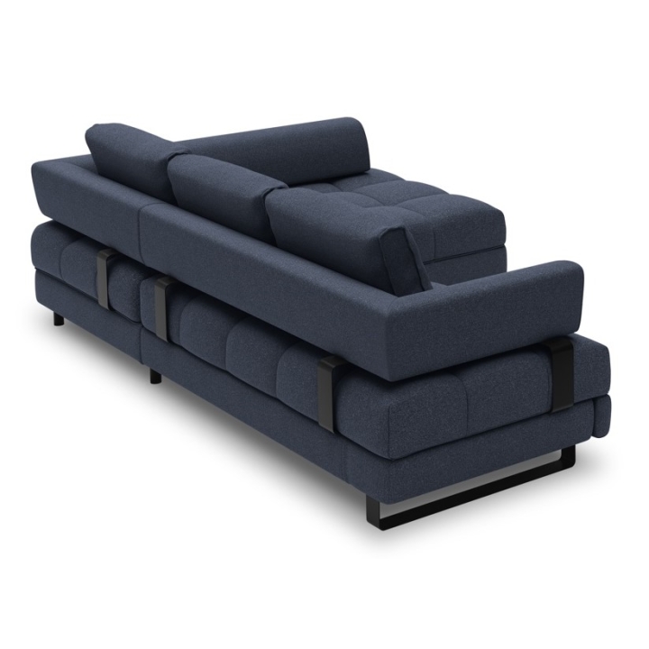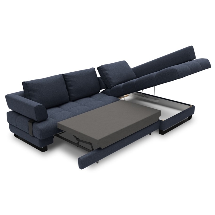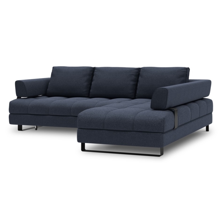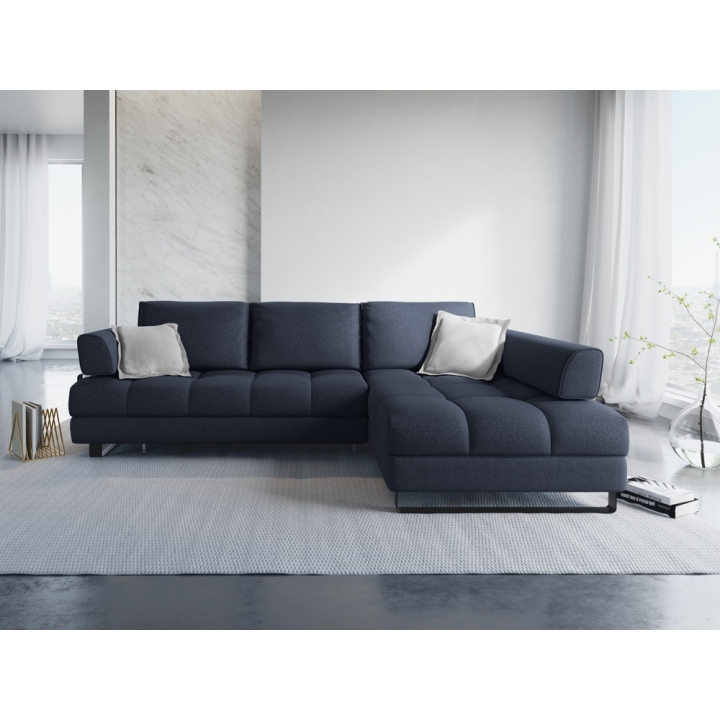 The Clinton 5-seater corner sofa in Structured Fabric Cosmopolitan-design is a large corner sofa with sleeping function and bedding storage, ideal for modern interiors. It has a width of 272 cm, a depth of 173 cm, a height of 89 cm and armrests 16-20 cm wide and 72 cm high to provide comfortable support. The model features a chaise longue with a width of 79 cm and a usable depth of 13o cm to 151 cm when the cushions are removed, giving you a large surface to rest on. Black metal legs 12 cm high emphasise the modern look of the furniture and make it easy to keep clean.