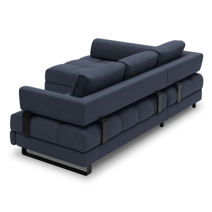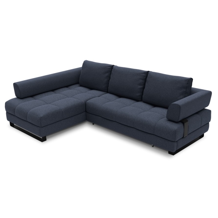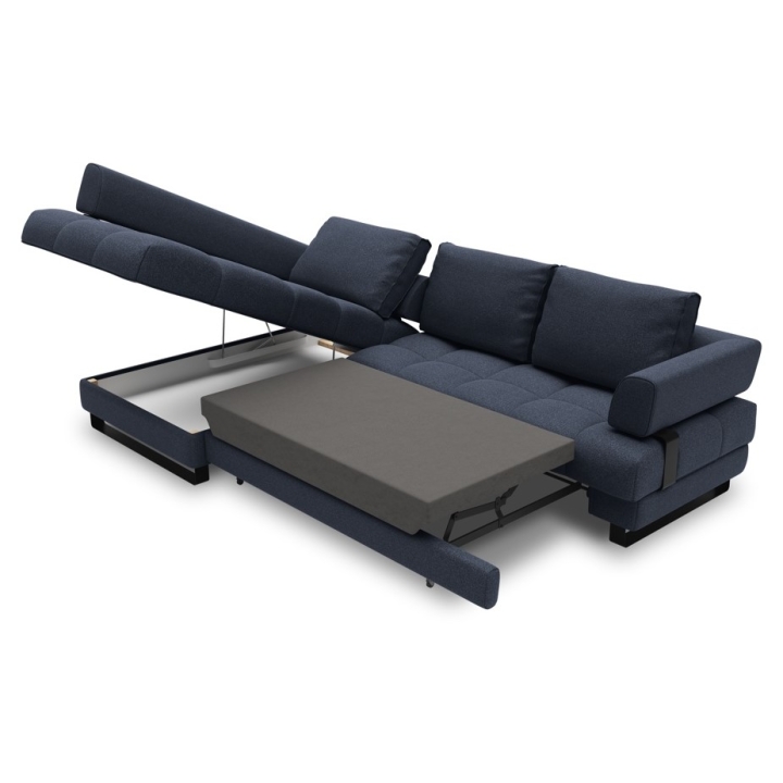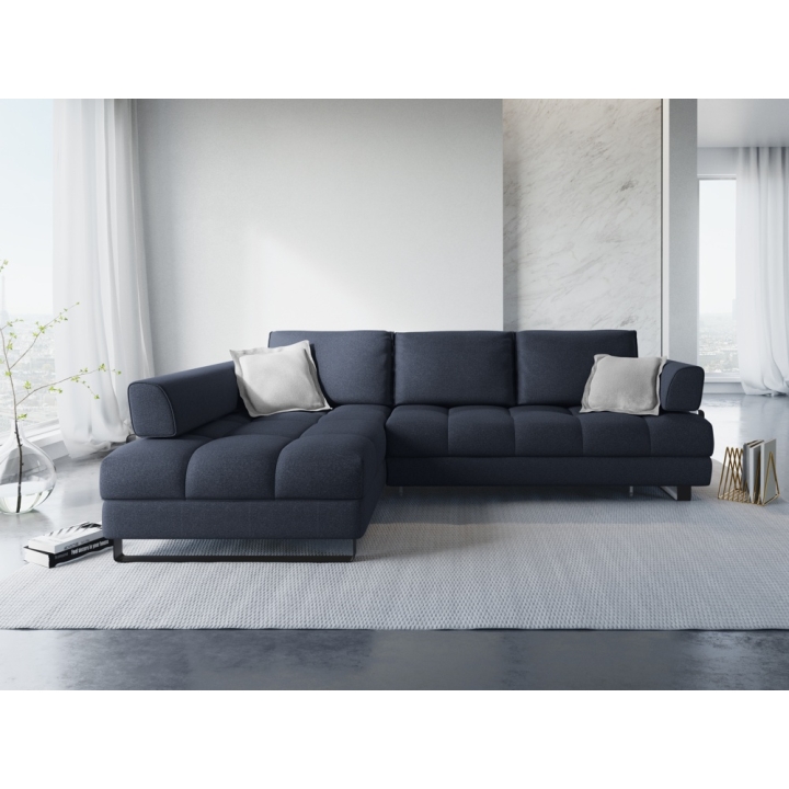 The Clinton 5-seater corner sofa in Structured Fabric Cosmopolitan-design is a large corner sofa with sleeping function and bedding storage, ideal for modern interiors. It has a width of 272 cm, a depth of 173 cm, a height of 89 cm and armrests 16-20 cm wide and 72 cm high to provide comfortable support. The model features a chaise longue with a width of 79 cm and a usable depth of 13o cm to 151 cm when the cushions are removed, giving you a large surface to rest on. Black metal legs 12 cm high emphasise the modern look of the furniture and make it easy to keep clean.