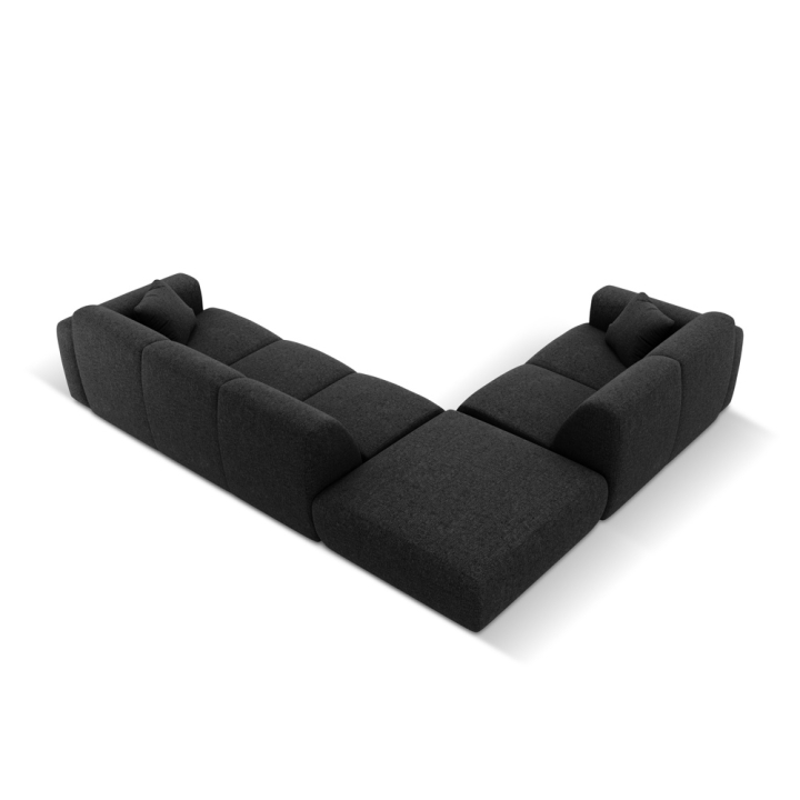 The corner sofa is upholstered in Haga chenille fabric, characterised by a subtle 3D effect and a soft, pleasant-to-touch surface. The material is abrasion resistant (>60,000 Martindale cycles), flame retardant and OEKO-TEX® STANDARD 100 certified, which confirms its safety and durability. The seat is filled with a combination of 28 kg/m³ polyurethane foam, a 300 g/m² oat layer and springs to ensure flexibility and comfort. The backrest is also filled with 28 kg/m³ polyurethane foam and 300 g/m² oat, which guarantees soft back support.
