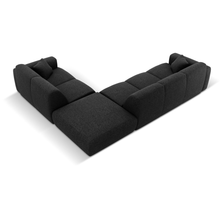 The corner sofa is upholstered in Haga chenille fabric, characterised by a subtle 3D effect and a soft, pleasant-to-touch surface. The material is abrasion resistant (>60,000 Martindale cycles), flame retardant and OEKO-TEX® STANDARD 100 certified, which confirms its safety and durability. The seat is filled with a combination of 28 kg/m³ polyurethane foam, a 300 g/m² oat layer and springs to ensure flexibility and comfort. The backrest is also filled with 28 kg/m³ polyurethane foam and 300 g/m² oat, which guarantees soft back support.