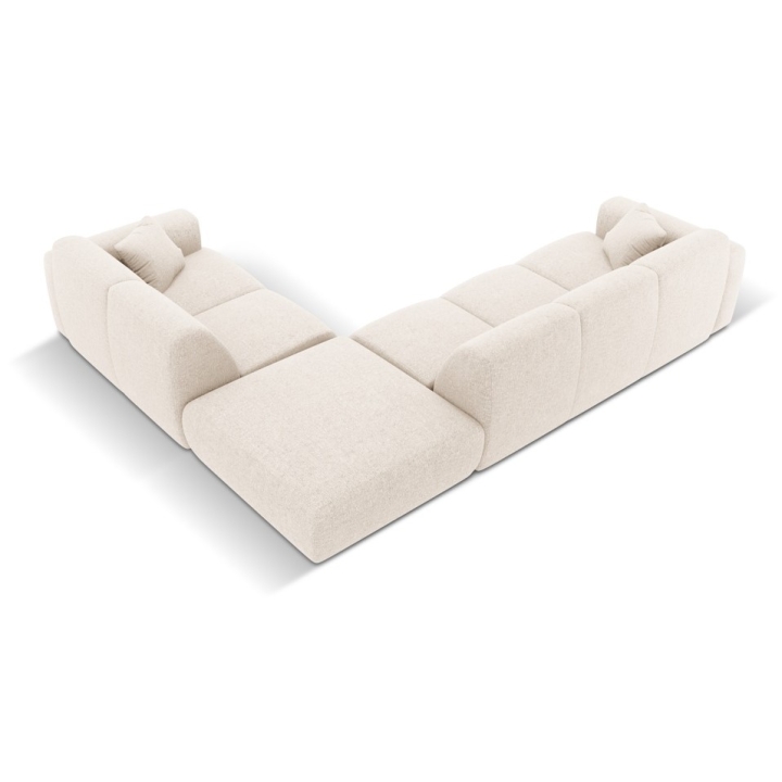 The corner sofa is upholstered in Haga chenille fabric, characterised by a subtle 3D effect and a soft, pleasant-to-touch surface. The material is abrasion resistant (>60,000 Martindale cycles), flame retardant and OEKO-TEX® STANDARD 100 certified, which confirms its safety and durability. The seat is filled with a combination of 28 kg/m³ polyurethane foam, a 300 g/m² oat layer and springs to ensure flexibility and comfort. The backrest is also filled with 28 kg/m³ polyurethane foam and 300 g/m² oat, which guarantees soft back support.