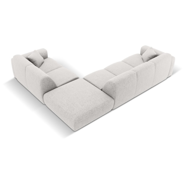 The corner sofa is upholstered in Haga chenille fabric, characterised by a subtle 3D effect and a soft, pleasant-to-touch surface. The material is abrasion resistant (>60,000 Martindale cycles), flame retardant and OEKO-TEX® STANDARD 100 certified, which confirms its safety and durability. The seat is filled with a combination of 28 kg/m³ polyurethane foam, a 300 g/m² oat layer and springs to ensure flexibility and comfort. The backrest is also filled with 28 kg/m³ polyurethane foam and 300 g/m² oat, which guarantees soft back support.