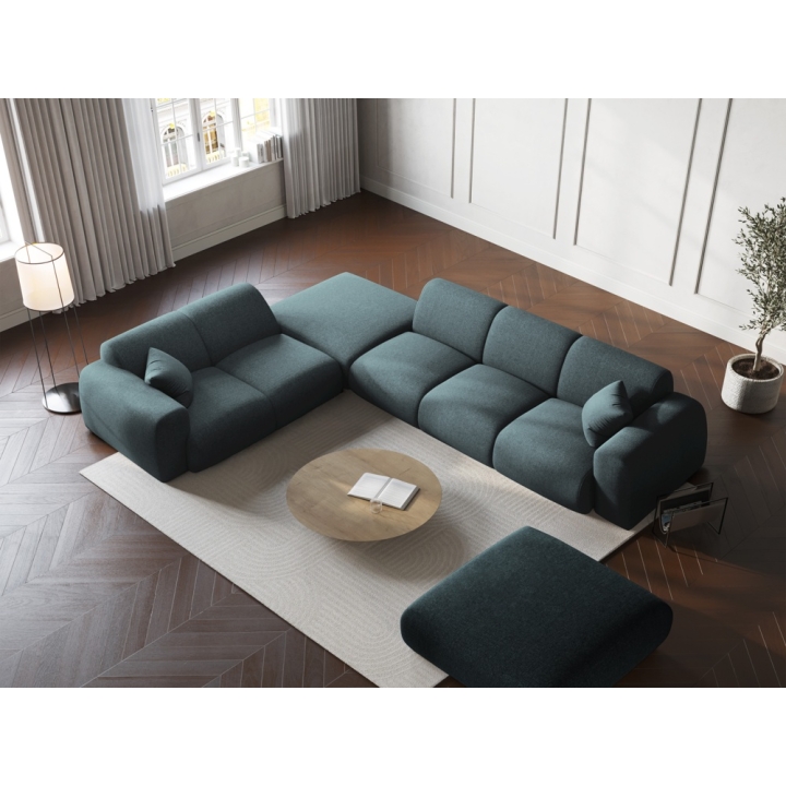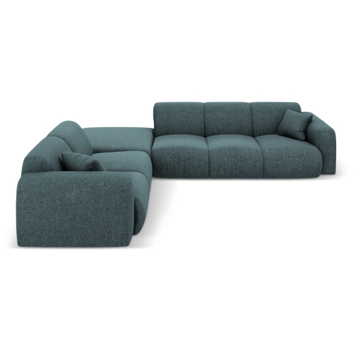 The corner sofa is upholstered in Haga chenille fabric, characterised by a subtle 3D effect and a soft, pleasant-to-touch surface. The material is abrasion resistant (>60,000 Martindale cycles), flame retardant and OEKO-TEX® STANDARD 100 certified, which confirms its safety and durability. The seat is filled with a combination of 28 kg/m³ polyurethane foam, a 300 g/m² oat layer and springs to ensure flexibility and comfort. The backrest is also filled with 28 kg/m³ polyurethane foam and 300 g/m² oat, which guarantees soft back support.