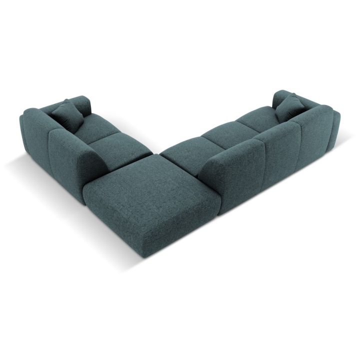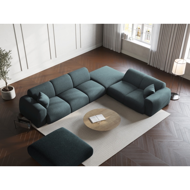 The corner sofa is upholstered in Haga chenille fabric, characterised by a subtle 3D effect and a soft, pleasant-to-touch surface. The material is abrasion resistant (>60,000 Martindale cycles), flame retardant and OEKO-TEX® STANDARD 100 certified, which confirms its safety and durability. The seat is filled with a combination of 28 kg/m³ polyurethane foam, a 300 g/m² oat layer and springs to ensure flexibility and comfort. The backrest is also filled with 28 kg/m³ polyurethane foam and 300 g/m² oat, which guarantees soft back support.