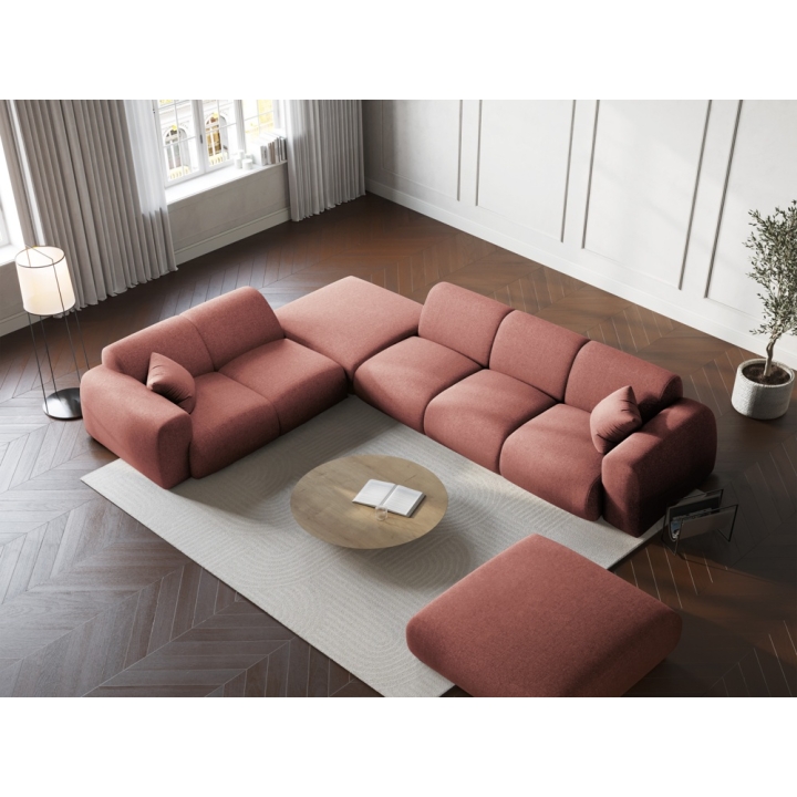The corner sofa is upholstered in Haga chenille fabric, characterised by a subtle 3D effect and a soft, pleasant-to-touch surface. The material is abrasion resistant (>60,000 Martindale cycles), flame retardant and OEKO-TEX® STANDARD 100 certified, which confirms its safety and durability. The seat is filled with a combination of 28 kg/m³ polyurethane foam, a 300 g/m² oat layer and springs to ensure flexibility and comfort. The backrest is also filled with 28 kg/m³ polyurethane foam and 300 g/m² oat, which guarantees soft back support.