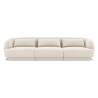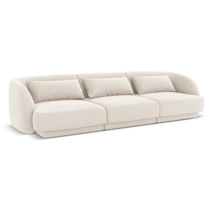 The Tulum Velour Cosmopolitan-design 3-seater sofa is a modern model with an oval shape that fits perfectly into stylish and designer interiors. Width 255 cm, depth 90 cm, height 70 cm are the overall dimensions of the furniture. The seat's usable width of -231 and its height of 40 cm and depth of 65 cm ensure comfortable rest. The upholstery in Bluvel velour fabric, available in a variety of colours, gives the sofa a velvety softness and a subtle sheen. Three decorative cushions are included to enhance the aesthetics of the furniture. The low black plastic legs are almost invisible, keeping the sofa light and elegant.