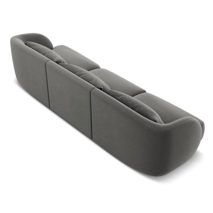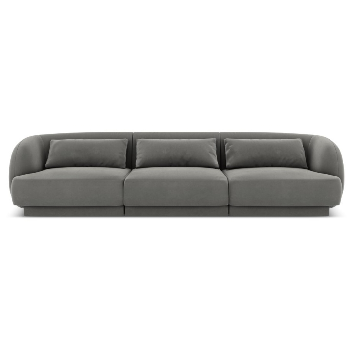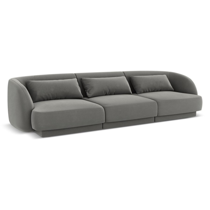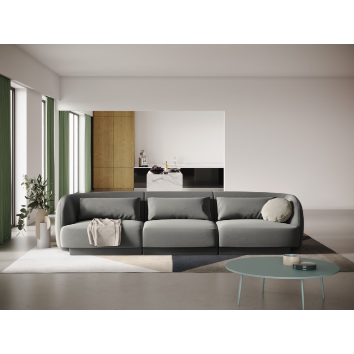 The Tulum Velour Cosmopolitan-design 3-seater sofa is a modern model with an oval shape that fits perfectly into stylish and designer interiors. Width 255 cm, depth 90 cm, height 70 cm are the overall dimensions of the furniture. The seat's usable width of -231 and its height of 40 cm and depth of 65 cm ensure comfortable rest. The upholstery in Bluvel velour fabric, available in a variety of colours, gives the sofa a velvety softness and a subtle sheen. Three decorative cushions are included to enhance the aesthetics of the furniture. The low black plastic legs are almost invisible, keeping the sofa light and elegant.