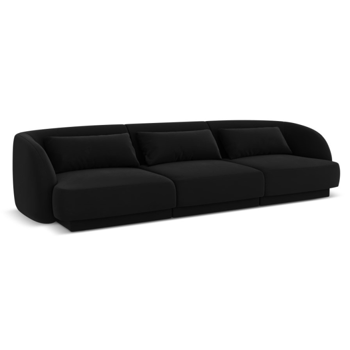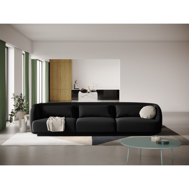 The Tulum Velour Cosmopolitan-design 3-seater sofa is a modern model with an oval shape that fits perfectly into stylish and designer interiors. Width 255 cm, depth 90 cm, height 70 cm are the overall dimensions of the furniture. The seat's usable width of -231 and its height of 40 cm and depth of 65 cm ensure comfortable rest. The upholstery in Bluvel velour fabric, available in a variety of colours, gives the sofa a velvety softness and a subtle sheen. Three decorative cushions are included to enhance the aesthetics of the furniture. The low black plastic legs are almost invisible, keeping the sofa light and elegant.