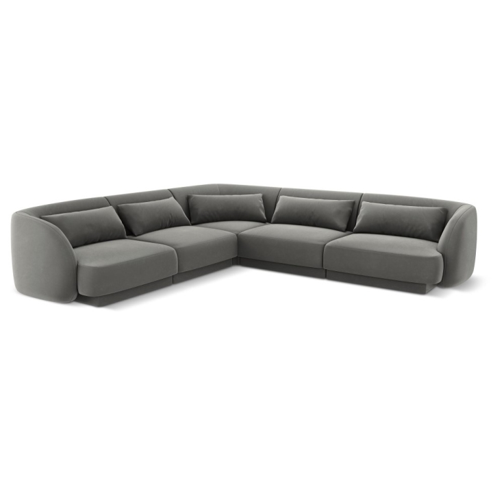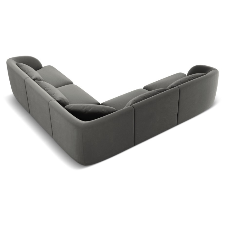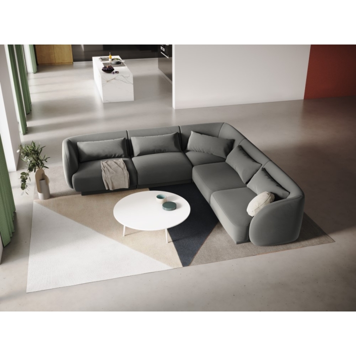 The Tulum Velour Cosmopolitan-design 5-seater corner sofa is a modern and designer corner sofa that stands out with its symmetrical design measuring 255 × 255 × 70 cm. The seat height of 40 cm and depth of 65 cm ensure a comfortable rest, while the low plastic legs add lightness to the piece. The upholstery in Bluvel velour fabric, available in a wide range of colours, is characterised by its exceptional softness, soft sheen and high abrasion resistance (50,000 Martindale cycles). The subtle structure of the fabric means that the colour can change shade depending on the angle of the light, adding elegance to the corner.