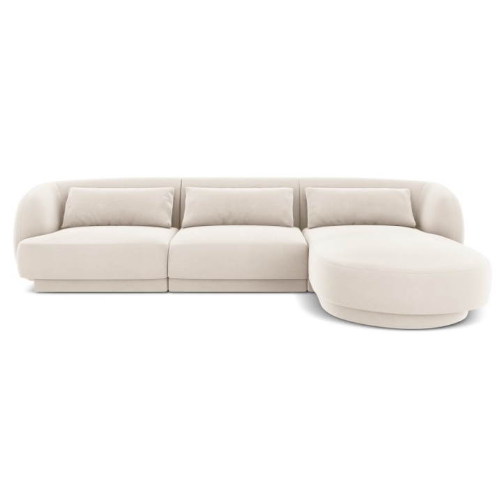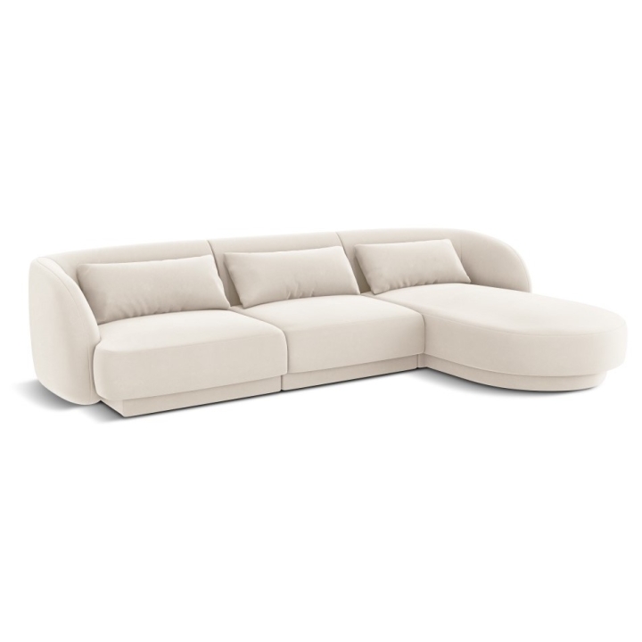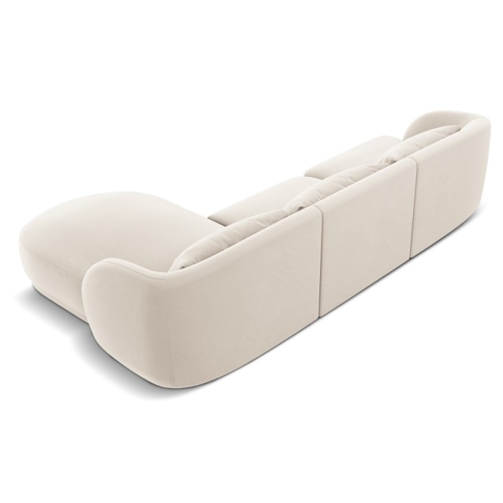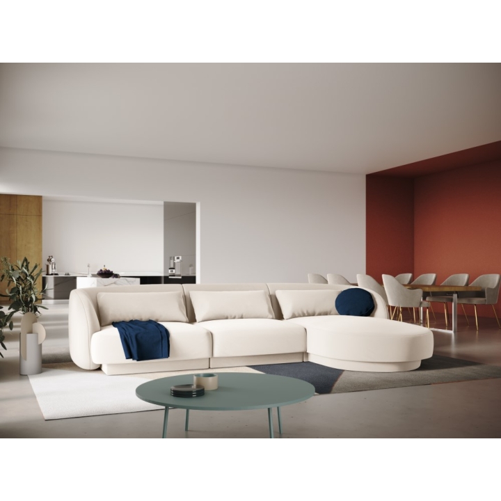 The 4-seater Tulum Velour Cosmopolitan-design corner sofa is a modern piece of furniture that combines minimalist design with exceptional comfort. Its rounded shapes and low plastic legs add lightness to the piece, while the upholstery in Bluvel velour fabric, available in a wide range of colours, provides an elegant look and a pleasant surface to the touch. With a width of 255 cm, a depth of 156 cm and a height of 70 cm, the model offers a comfortable seat at a height of 40 cm. The deep ottoman seat of 125/90 cm and the wide armrests of 63/70 cm height increase the comfort.