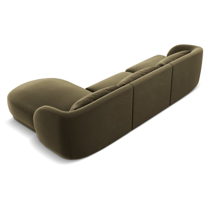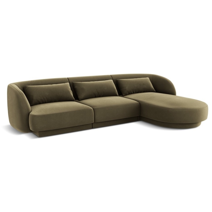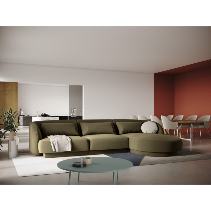 The 4-seater Tulum Velour Cosmopolitan-design corner sofa is a modern piece of furniture that combines minimalist design with exceptional comfort. Its rounded shapes and low plastic legs add lightness to the piece, while the upholstery in Bluvel velour fabric, available in a wide range of colours, provides an elegant look and a pleasant surface to the touch. With a width of 255 cm, a depth of 156 cm and a height of 70 cm, the model offers a comfortable seat at a height of 40 cm. The deep ottoman seat of 125/90 cm and the wide armrests of 63/70 cm height increase the comfort.