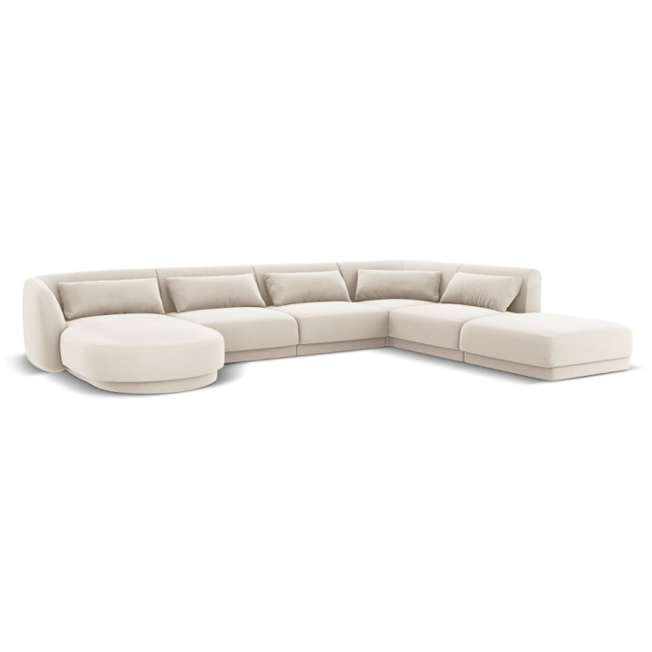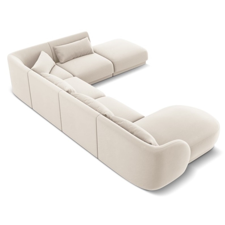 The 6-seater Tulum Velour Cosmopolitan-design corner sofa is a spacious, modern piece of furniture that is perfect for large living rooms. Its rounded shapes and low plastic legs, which are almost invisible, give it a light and subtle character. The width of the corner sofa is 330cm, the depth of one side is 255cm and the other 156cm, the total height is 70cm and the seat height is 40cm, ensuring a comfortable rest. The model is available in a left or right-hand version to match the interior layout. The upholstery in Bluvel velour fabric, available in various colours, is characterised by its exceptional softness and elegant sheen.