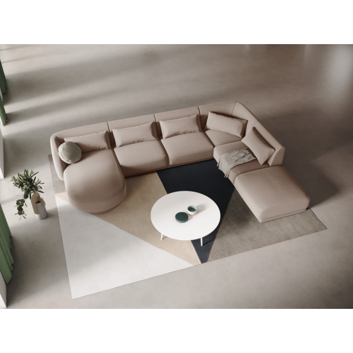 The 6-seater Tulum Velour Cosmopolitan-design corner sofa is a spacious, modern piece of furniture that is perfect for large living rooms. Its rounded shapes and low plastic legs, which are almost invisible, give it a light and subtle character. The width of the corner sofa is 330cm, the depth of one side is 255cm and the other 156cm, the total height is 70cm and the seat height is 40cm, ensuring a comfortable rest. The model is available in a left or right-hand version to match the interior layout. The upholstery in Bluvel velour fabric, available in various colours, is characterised by its exceptional softness and elegant sheen.